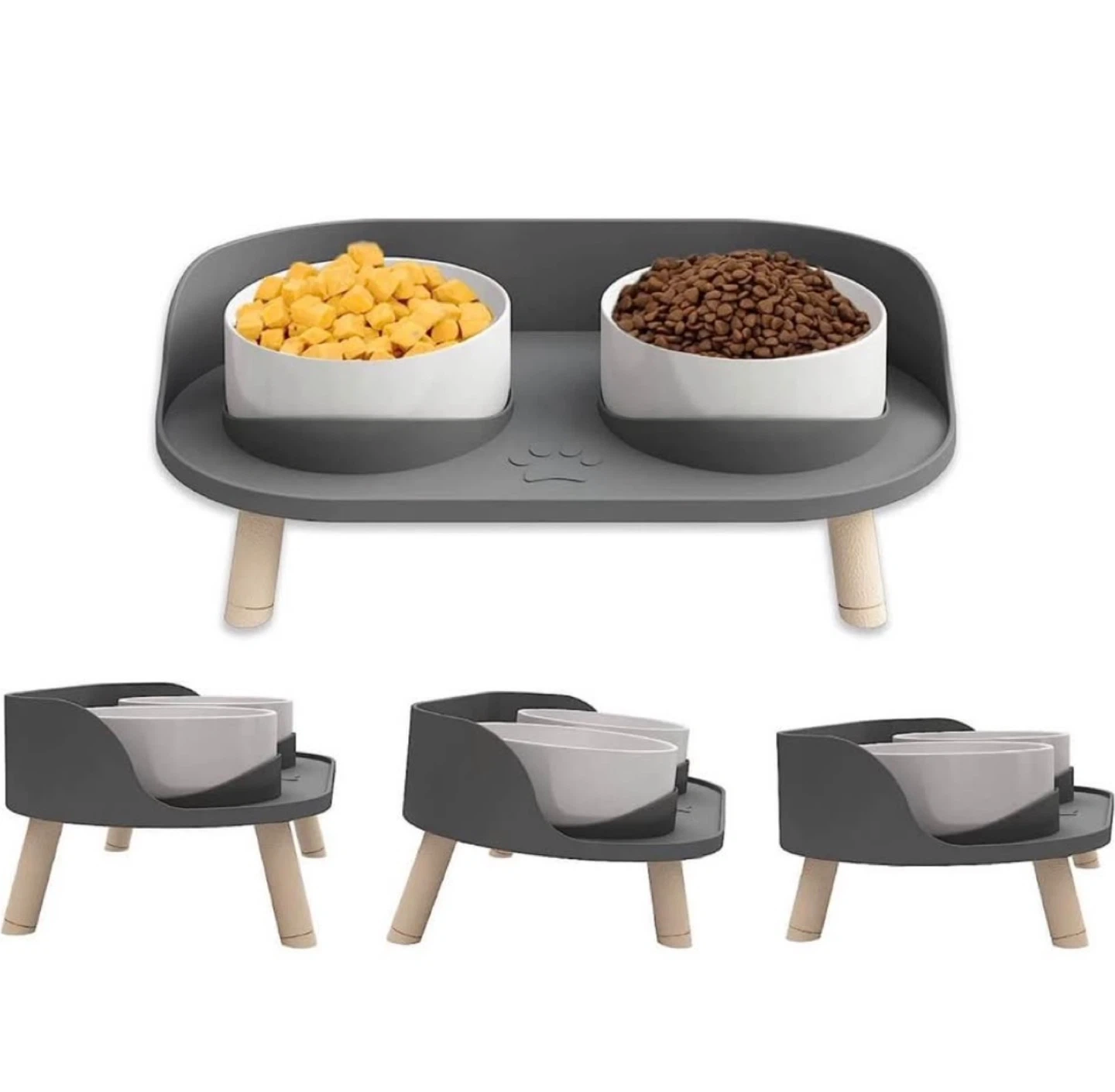 Selling a ceramic cat bowl set with a stand. It features two bowls, each with a 16oz capacity, perfect for food and water. The design helps prevent spills and reduces vomiting. The stand has a cute paw print detail