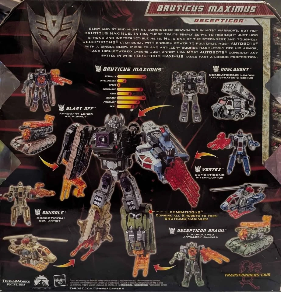 Transformers Revenge Of The Fallen Target Exclusive Combiners Class 'Bruticus Maximus'. Brand new in original retail store condition. Not a re-release! This is the characters, Onslaught, Blast Off, Brawl, Swindle, & Vortex to form 'Bruticus Maximus' not actually featured in Michael Bay's second movie of the franchise. All 5 Robots Change into vehicles and each become a part of the giant. This toy was available in retail store's back in 2010. Check out my other Voyager class Decepticons, plus many other listings for collectable toys and other pop culture collectable items on my page?