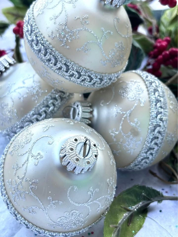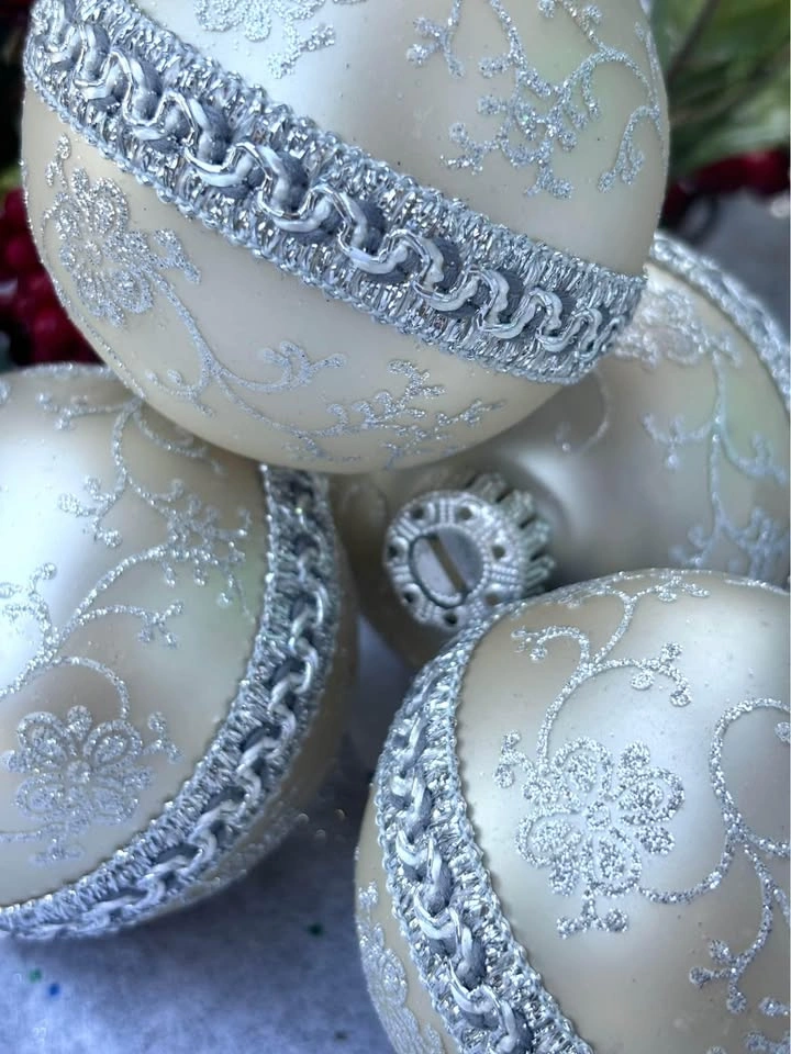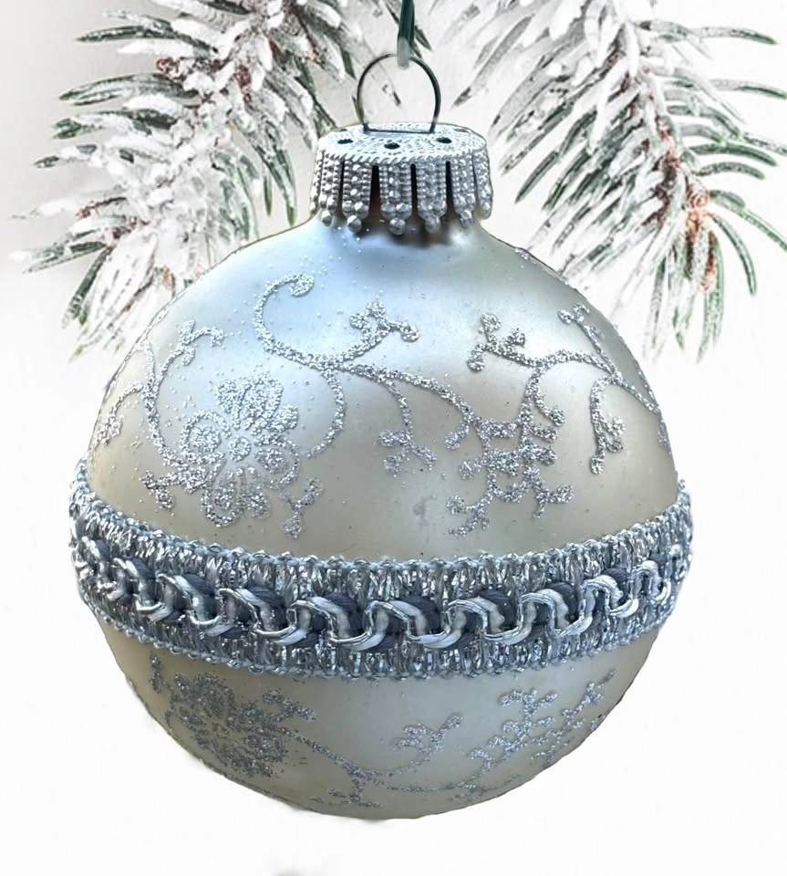Blown matte glass handcrafted and embellished with silver glitter featuring botanical designs, wrapped with a strip of sparkly silver fabric.