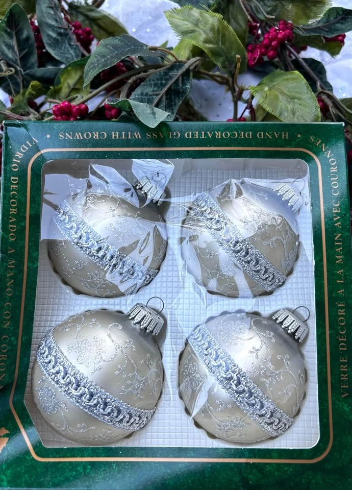 Vintage Ornaments - Blown Glass in Soft Matte Gold with Sparkly Silver Fabric & Glitter. 1 Box of 4 available. Like New / Never Used.