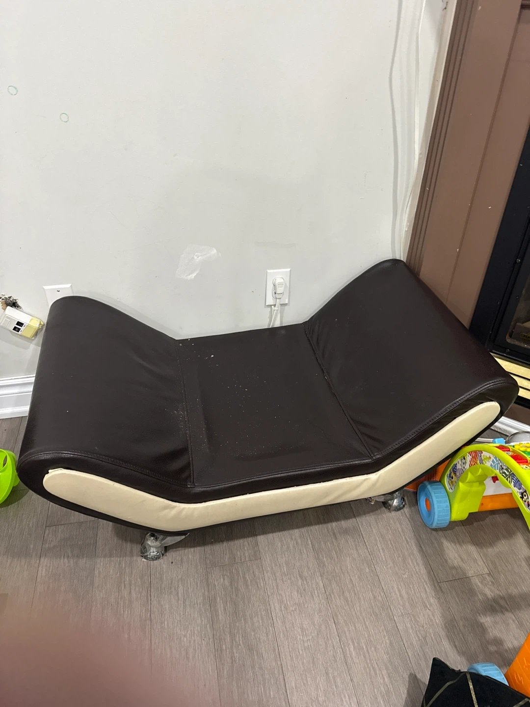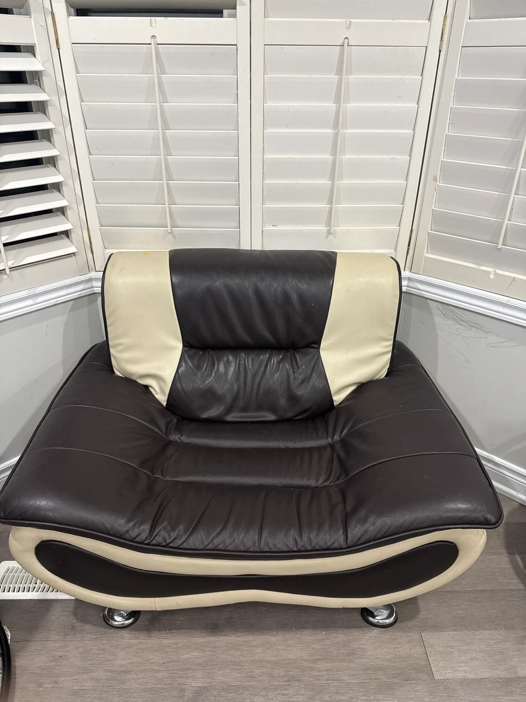Selling a comfy brown and cream leather sofa set! It's in good condition and has a unique, modern design. Perfect for a living room or entertainment area