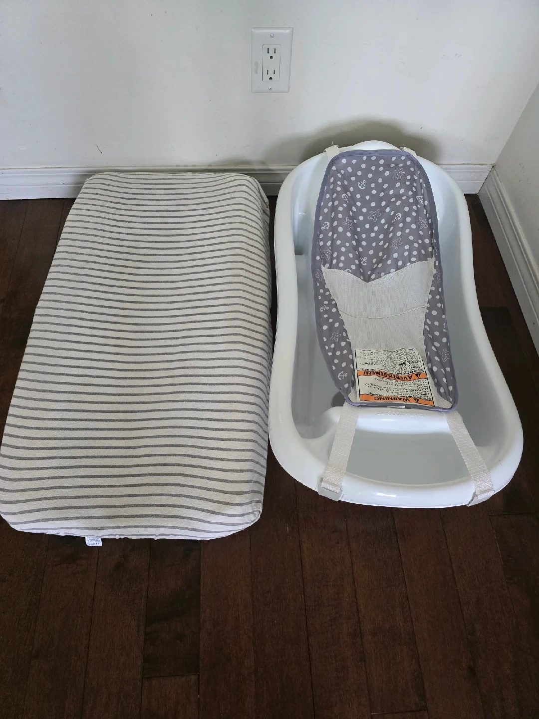 Selling a baby bathtub that comes with a sling and a striped pad. Perfect for bathing your little one safely and comfortably! The sling provides support, and the pad adds extra cushioning.30 dollar for both item.