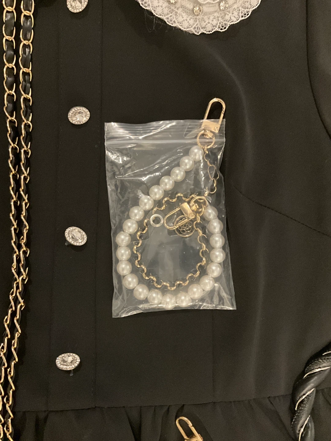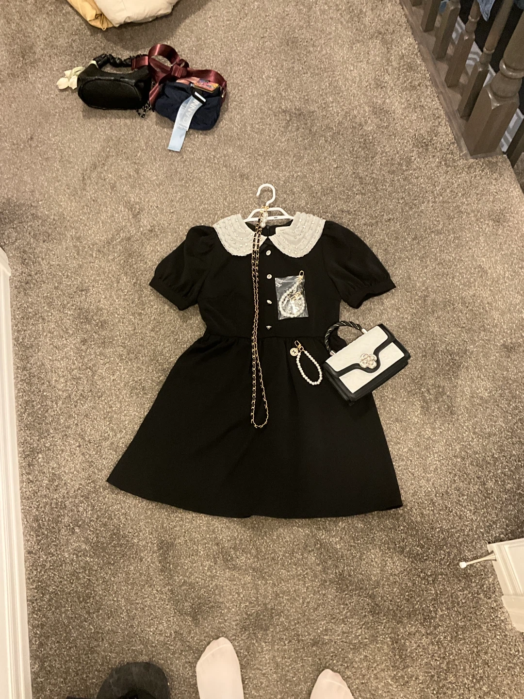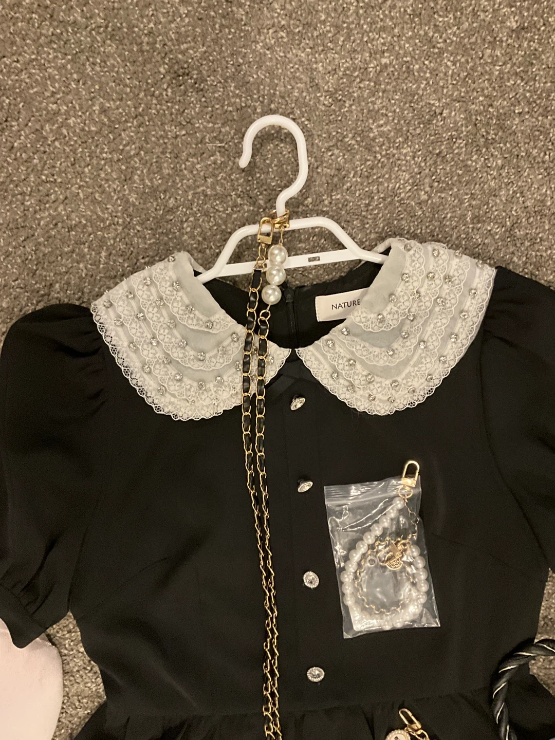 Cute black dress from Nature, perfect for any occasion! It comes with a detachable pearl bracelet and a gold chain, adding a touch of elegance. The dress features a charming white lace collar and button details. It's in great condition and ready for a new home!