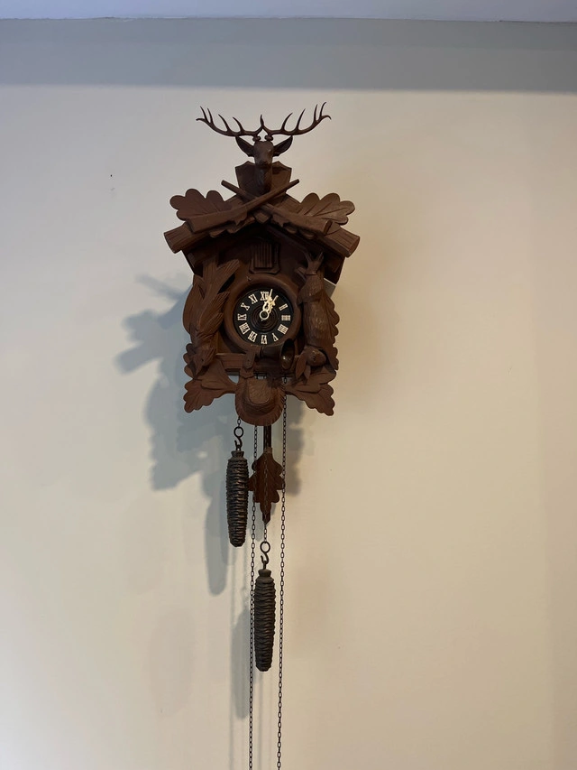 This is a used Black Forest Cuckoo Clock with a very detailed carving, showcasing a hunting theme with a deer and birds. It's a delightful timepiece that brings a touch of traditional charm to any room. Being a used item, it possesses a unique character with slight wear that tells a story of its past. Here are some of its features: * Hand-carved details * Traditional Black Forest design * Animated cuckoo bird * Pinecone weights I'm pricing it at $325, based on comparable Kijiji listings for similar vintage clocks. If you're reading this, the clock is still available!