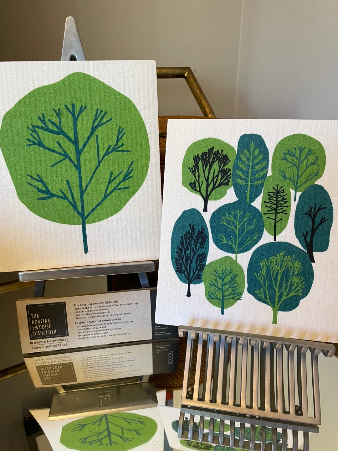 These Swedish dishcloths are reusable and low-waste, making them a great eco-friendly alternative to paper towels! They're 100% compostable and can be used in the kitchen, bathroom, office, boat, or cottage. One cloth is equivalent to 15 rolls of paper towels, and each can be used for 9-12 months. You get 2 in a pack! . Located in Osborne Village with easy accessible driveway for pickup . Selling a set of 2 modern trees patterned Swedish Dishcloths. Comes banded with original wrap perfect for a hosting gift . 6.5" x 8" 16.50 x 20.32 cm set of two eco-friendly cellulose cotton 100% biodegradable ultra absorbent machine washable replaces up to 15 rolls of paper towel lasts for 12 months great in the kitchen, bathroom, office, boat, and cottage you may also like to see more in my other listings as well. Regular retail is 12.95 for these sets Accepting etransfer for guaranteed hold and cash transactions are FCFS Please.