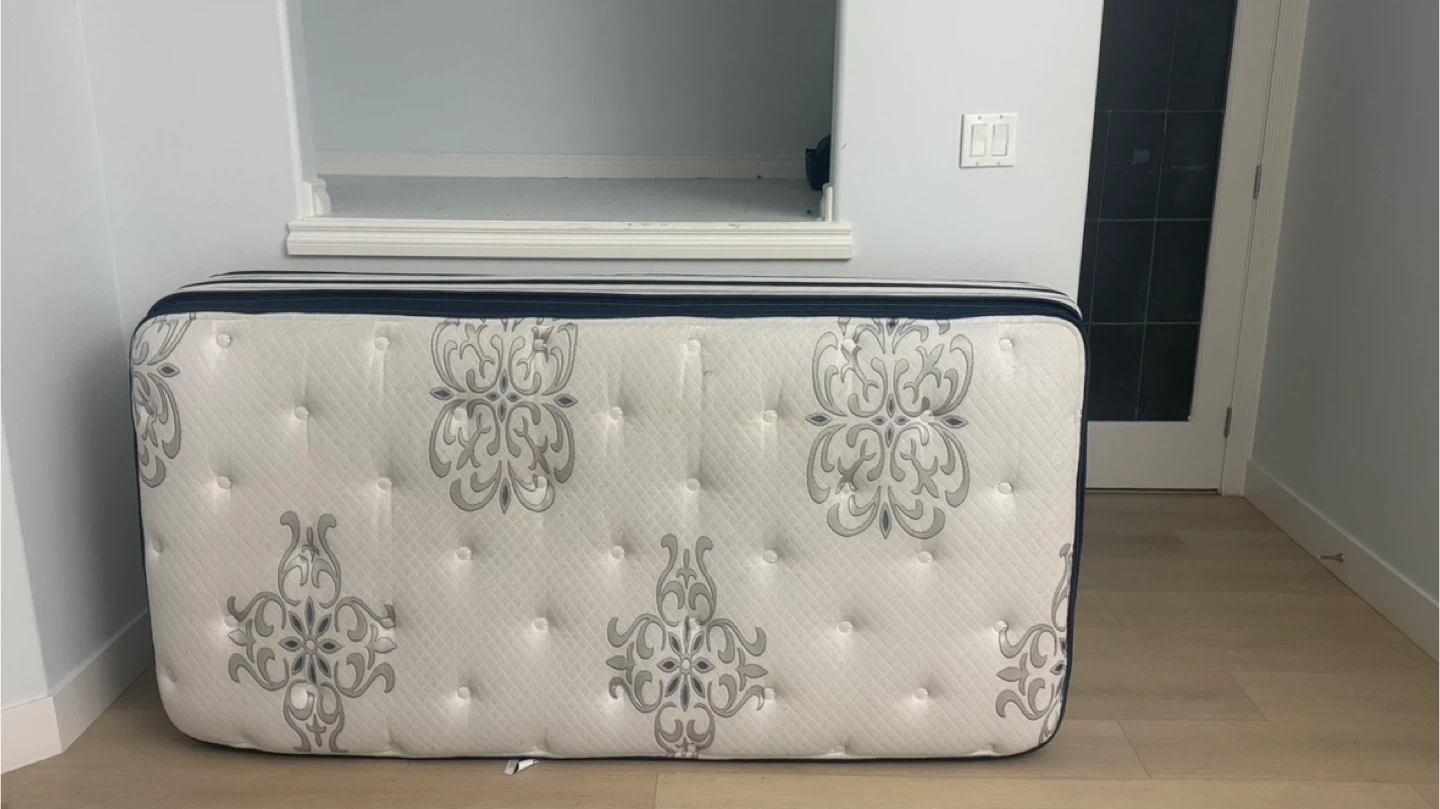 Selling a mattress in great condition. It features a white quilted top with a floral pattern and navy blue striped sides. Ready for a new home! Size -twin size ,bought for 600.