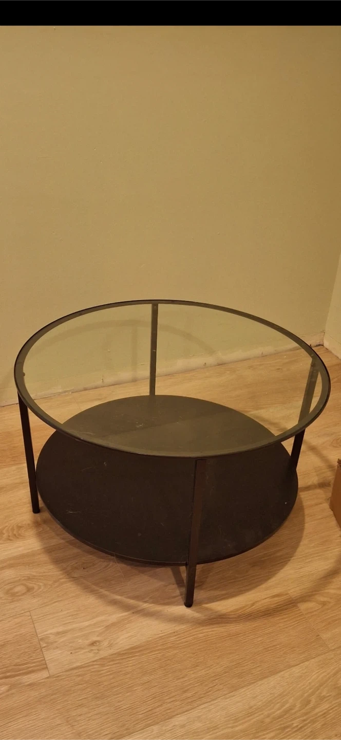 Selling a round coffee table with a glass top and a black metal frame. It features a second tier for extra storage or display. It's in good condition and would be a great addition to any living room