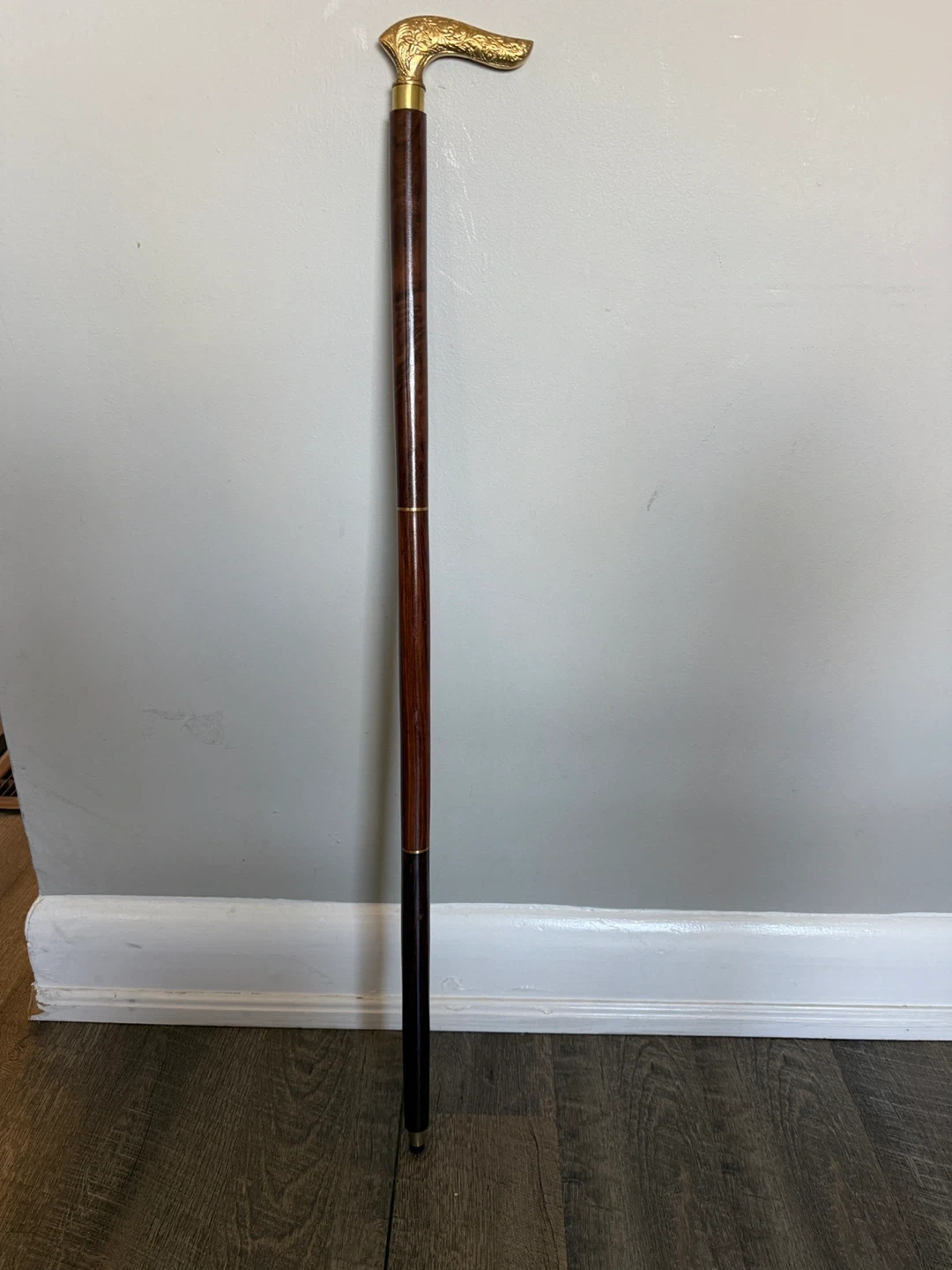 Here's a stylish walking cane with an ornate gold-coloured handle and a wooden shaft. It's in great shape and ready to add a touch of elegance to your strolls