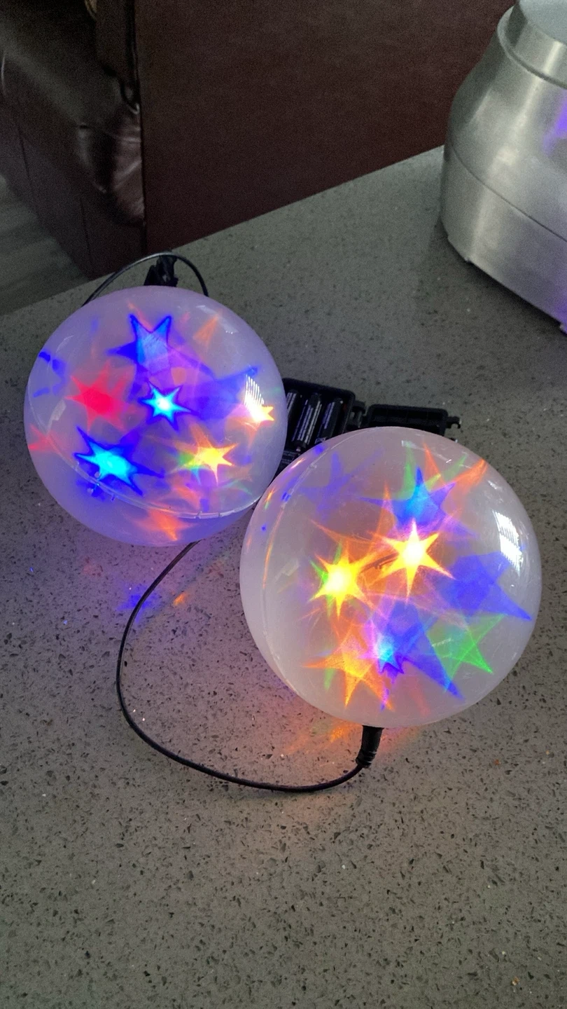 These Star Shower Star Motion lights balls are a good size are perfect for adding a festive touch to any occasion! Very unique. They feature a timer with different settings like Glisten, Twinkle, and Steady On. Batteries not included Indoor or outdoor I always used them in my outdoor display since you can see them so well at a distance. One clasp on each battery box is missing a clasp but it hasn’t changed the functionality