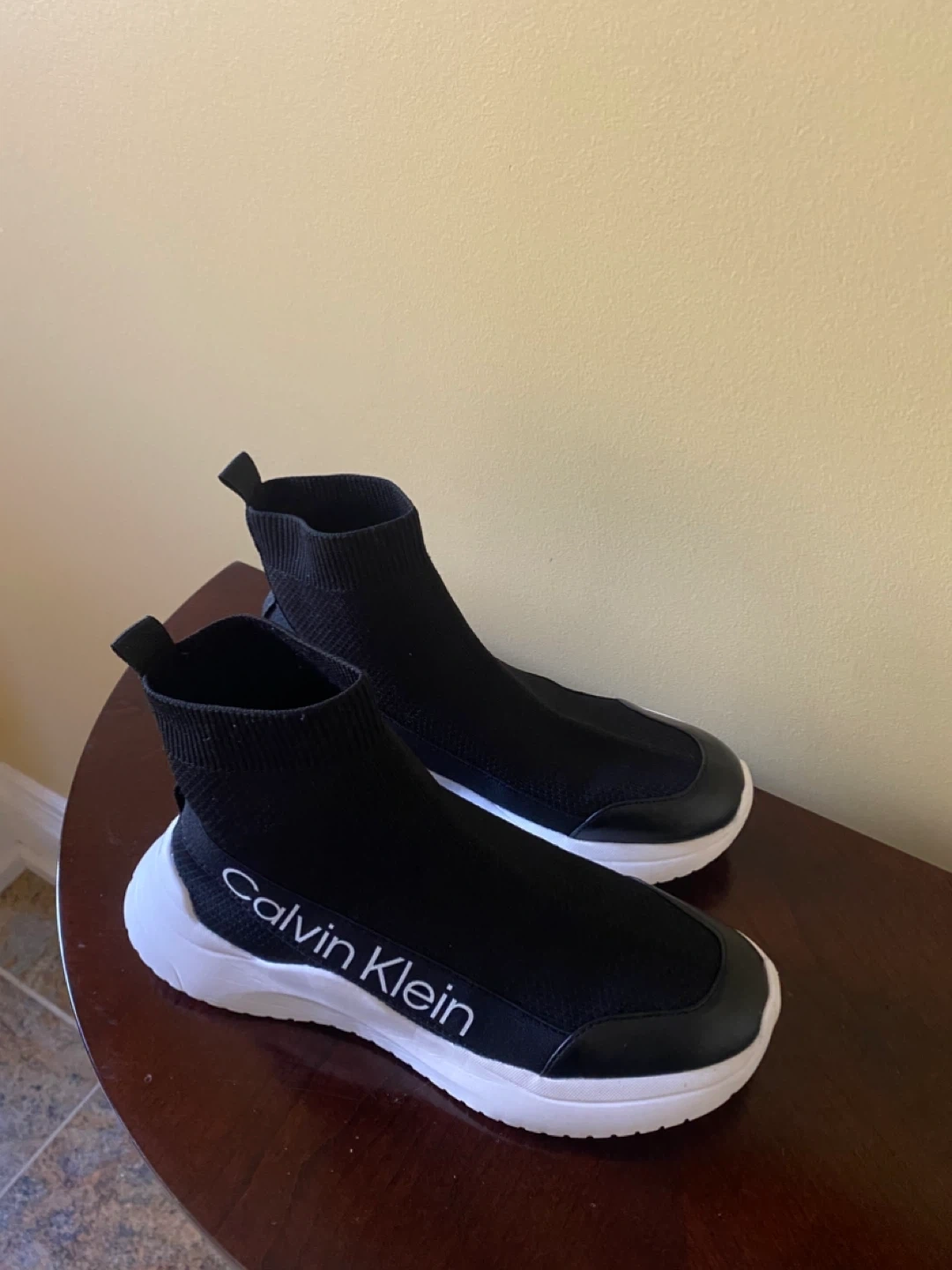 Selling a pair of Calvin Klein sock sneakers in black. They feature the Calvin Klein logo on the side and have a comfortable, sock-like fit. These are perfect for casual wear!