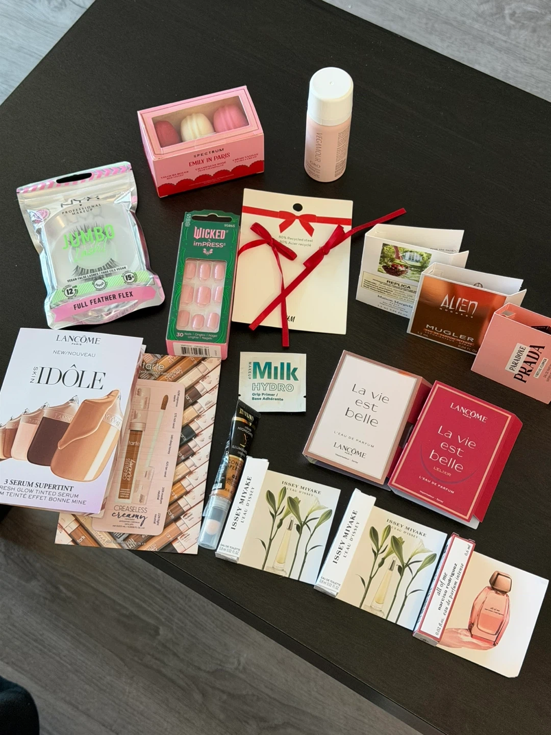 Cosmetics samples, false eyelashes and nails, makeup sponges, dry shampoo are brand new. Perfume samples are open (I tried them all once).