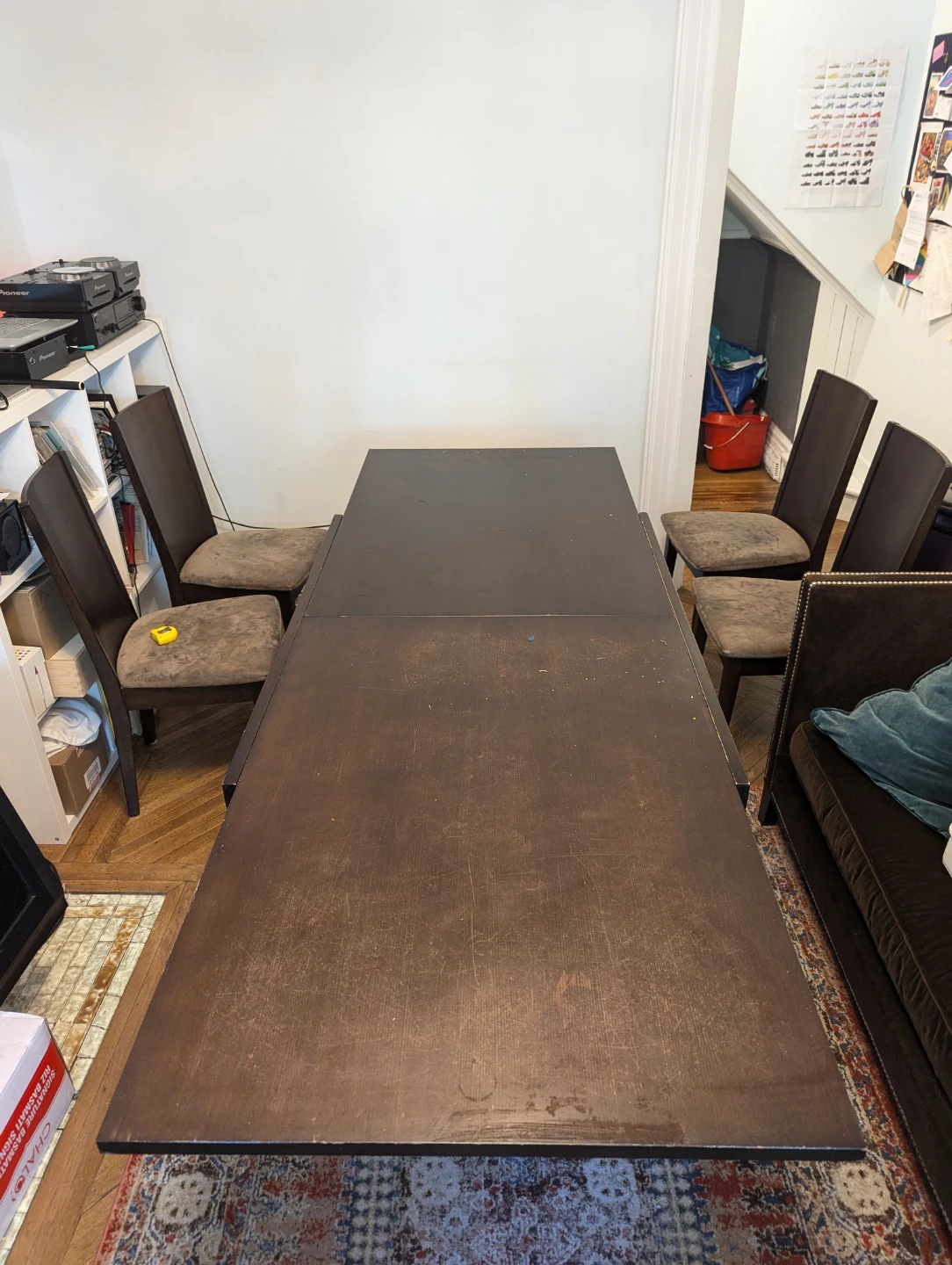 Selling a dark brown dining table (47)with four matching chairs. The table is extendable (94.5 inch), making it perfect for both small and large gatherings. It's in good condition and ready to find a new home!