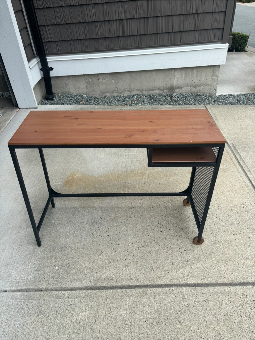 Selling a desk with a wooden top and a black metal frame. It has a small shelf on one side and is on wheels for easy moving. Great for a home office or study space!