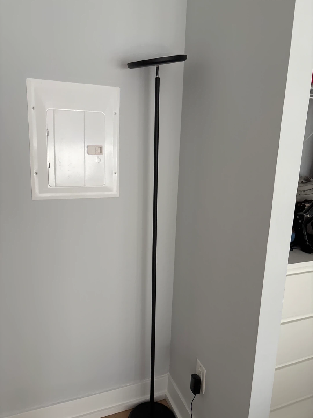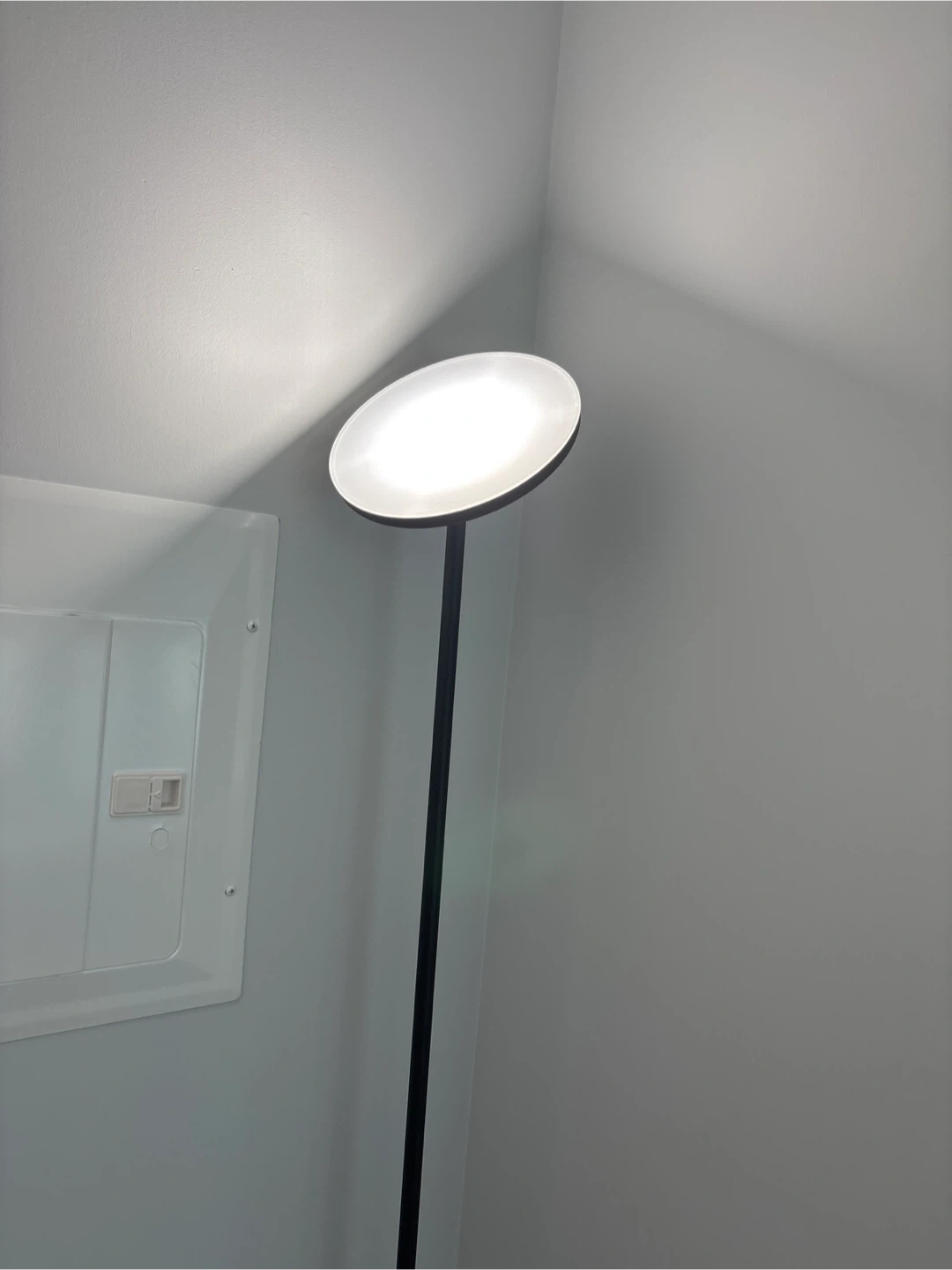 Selling a modern LED floor lamp in black. It comes with a remote control offering different light settings like night, read, working, and leisure modes. Perfect for adding a touch of style and functionality to any room!