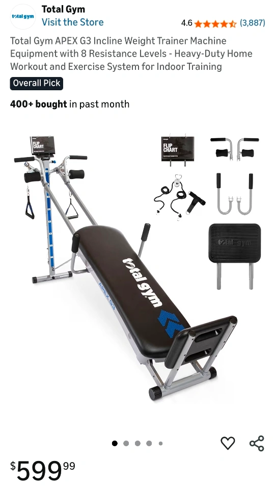 Selling a Brand New Total Gym APEX G3 Incline Weight Trainer Machine Equipment with 8 Resistance Levels. It's a heavy-duty home workout and exercise system for indoor training. Perfect for seated chest press, seated chest fly, incline push-up, lateral chest fly, and compound surfer exercises. . Can't use due to severe medical issues. Asking $400 or best offer Pick up in Bloomfield will need two people to cary.