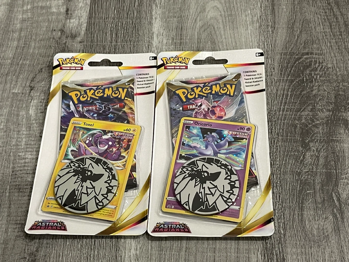 15Selling a duo of 2 brand new, sealed, Astral Radiance Checklane Blister Packs. Each Blister pack contains: * 1 Foil Promo Card Featuring either Toxel or Oricorio * 1 Pack of Astral Radiance * 1 Jumbo Coin featuring Zeraora * 1 Code card for the Pokemon TCG online game Prefer to sell as a bundle but will sell individually for $20 each.