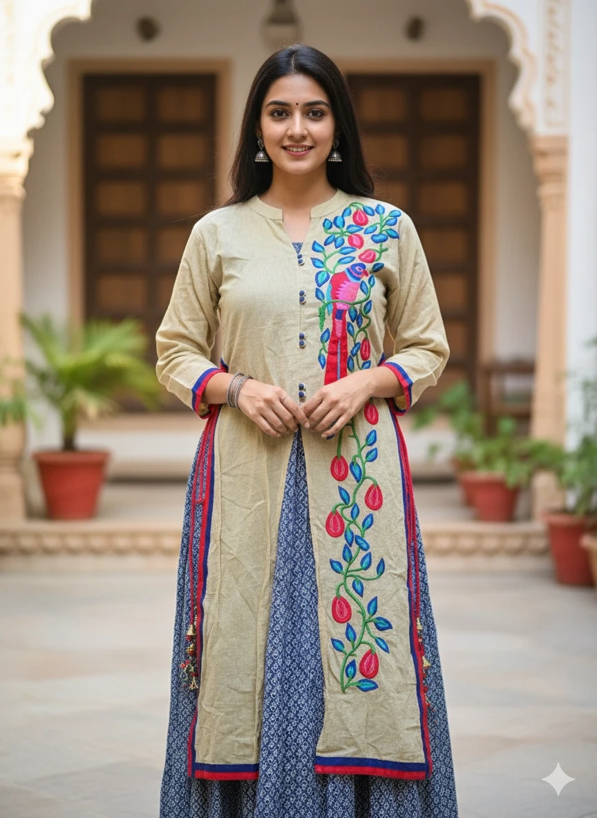 This is a beautiful kurti dress with intricate embroidery. The dress features a unique design with a bird and floral pattern. It's perfect for a special occasion or everyday wear!