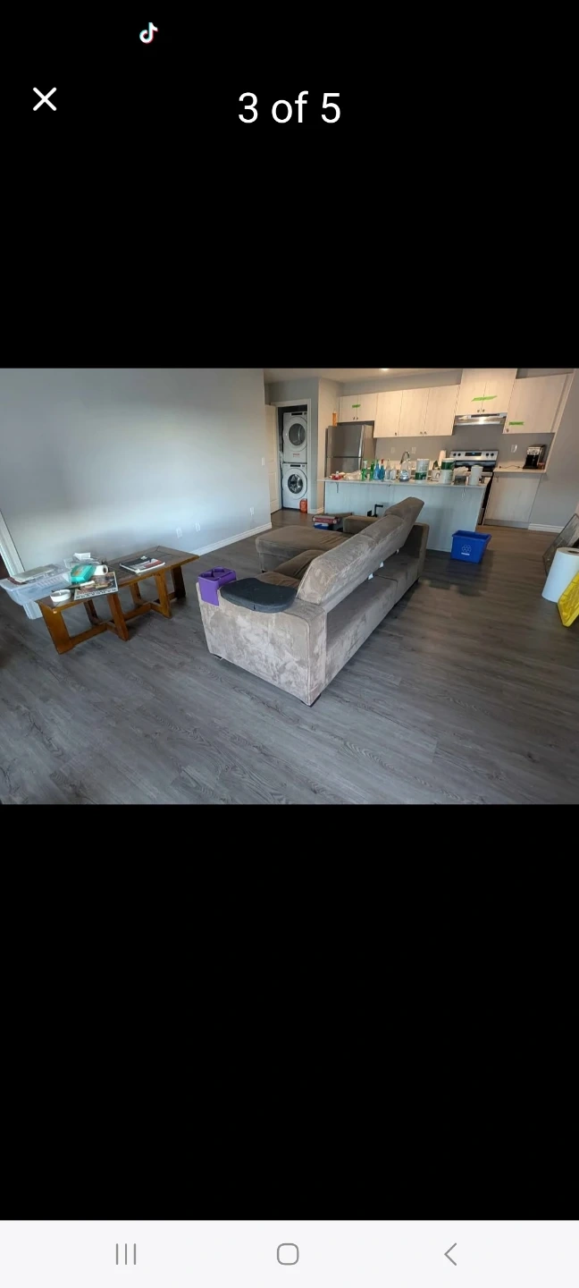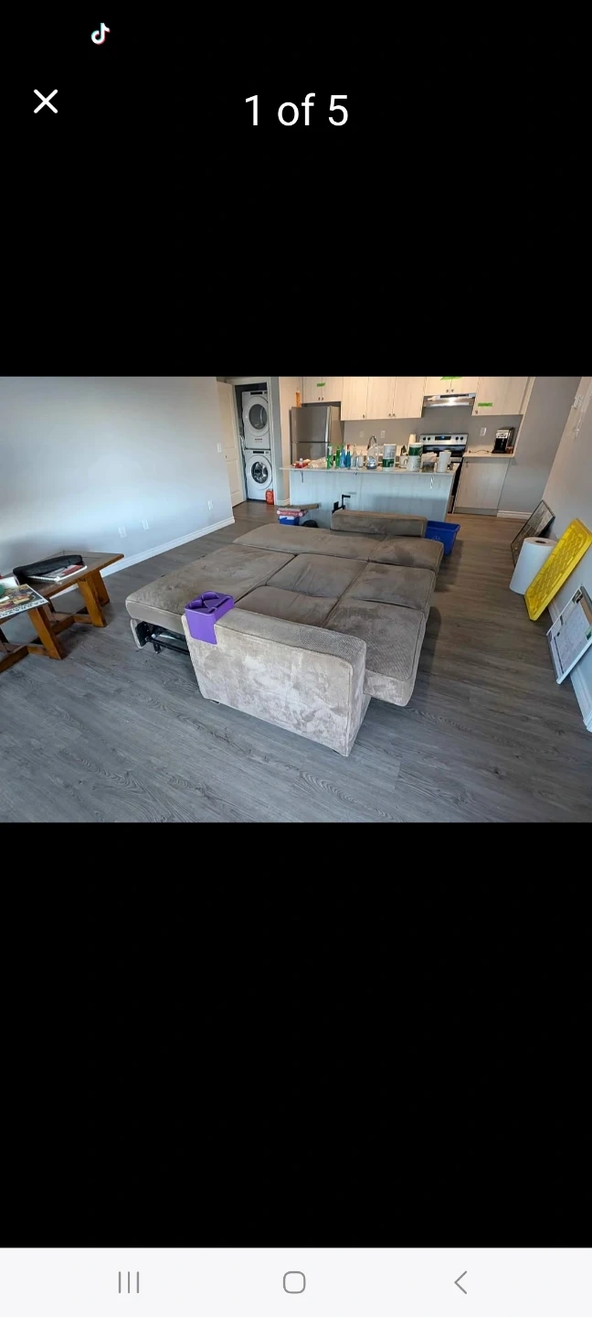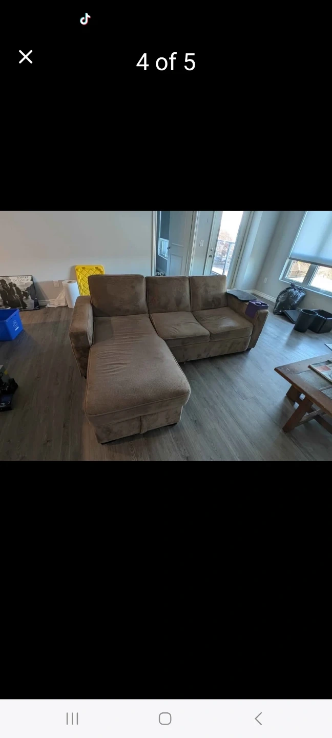 Selling a comfy beige sectional sofa. It features a chaise lounge for extra relaxation. The sofa shows some signs of use but still has plenty of life left. Perfect for a living room or entertainment space! Modular couch, can be flattened or angled or straight upright. Room for storage in the long section underneath. No stains or issues with the functionality. Moved to a new apartment and no longer need the couch.