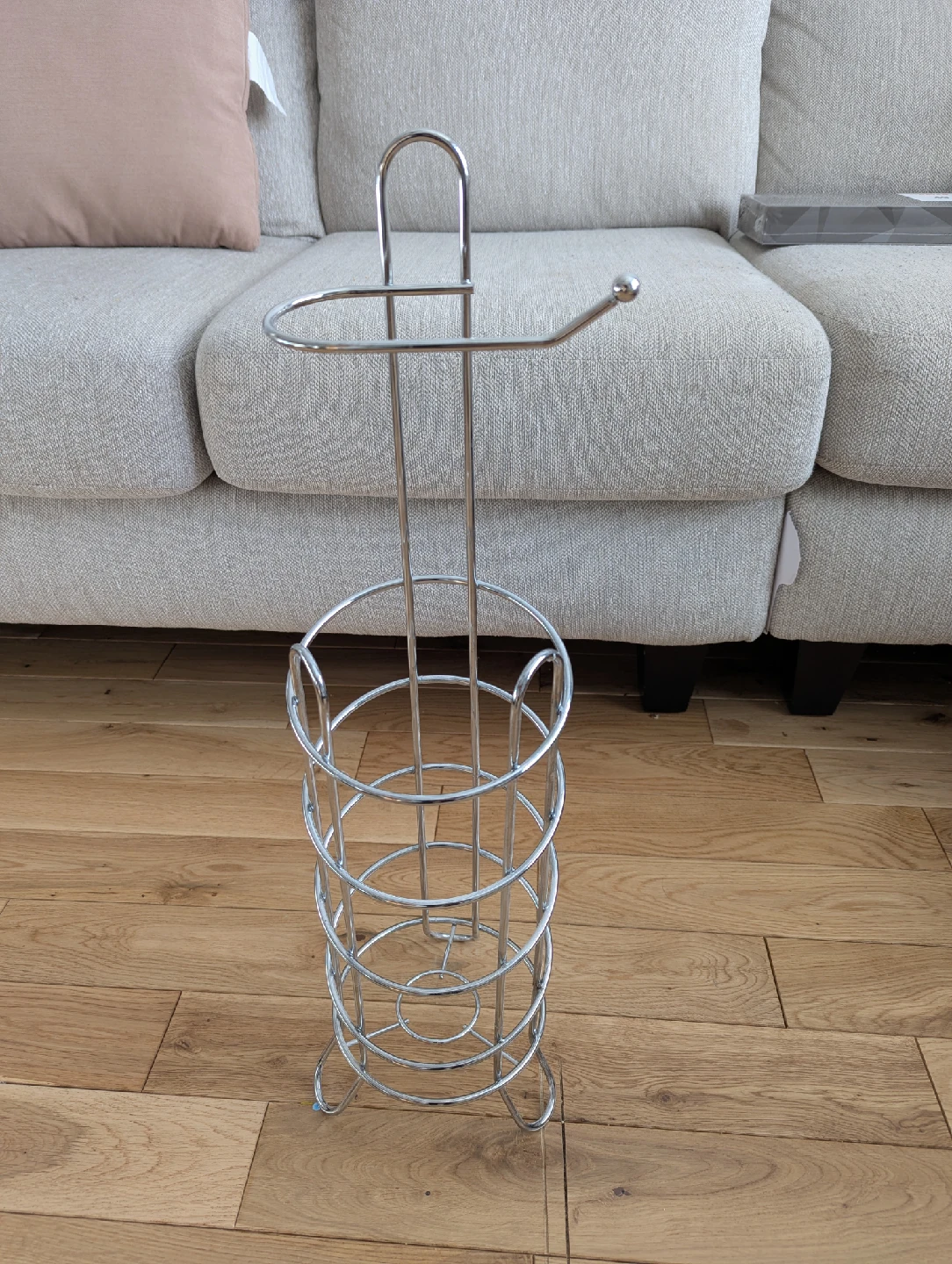 Keep your bathroom organized with this chrome toilet paper holder stand! It holds a roll on top and has storage for extra rolls at the bottom. A simple and functional addition to any bathroom.