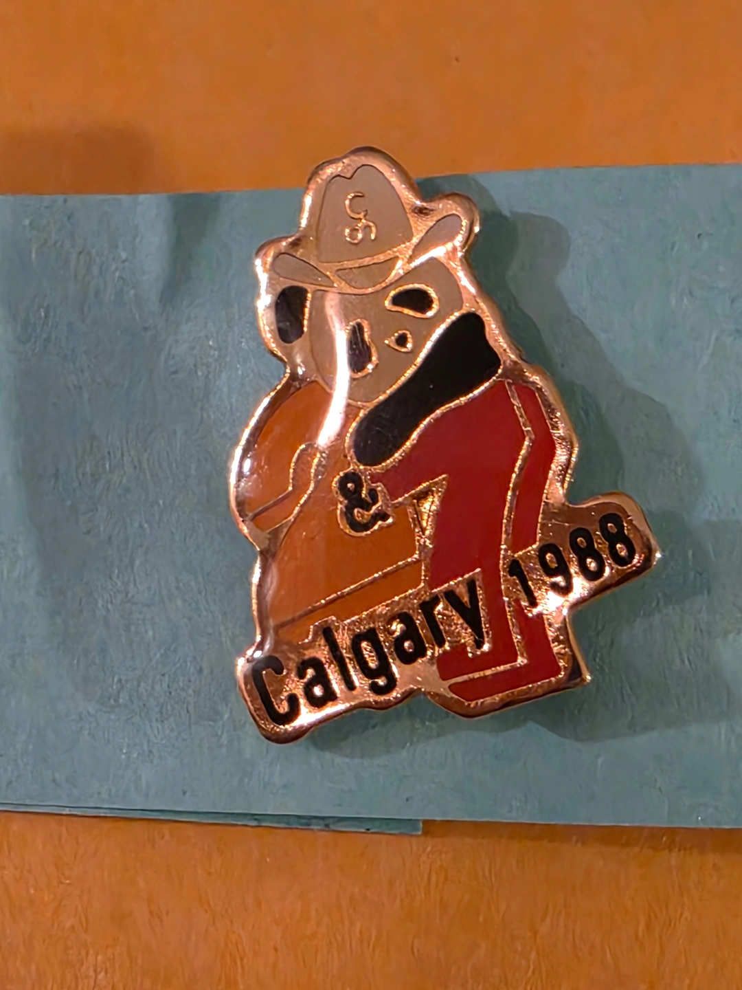 Selling a Calgary 1988 Olympics pin! This pin features a cartoon koala wearing a cowboy hat and a red and yellow outfit. It's a great piece of memorabilia for any collector or fan of the Olympics.