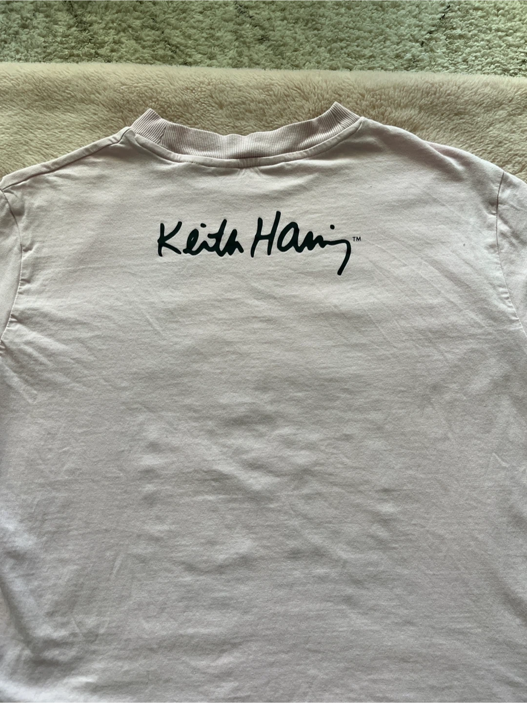 Selling a cute H&M long sleeve top featuring Keith Haring's artwork! The shirt is a light pink colour with a red heart design on the front and Haring's signature on the back. Even the sleeves feature his designs.