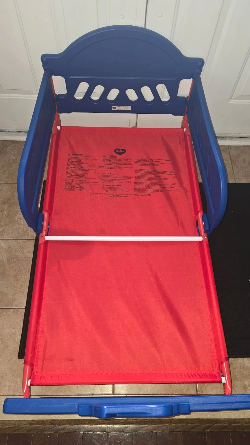 Selling a Delta Children nap cot in red and blue. It's in good condition and perfect for daycare or home use for toddlers