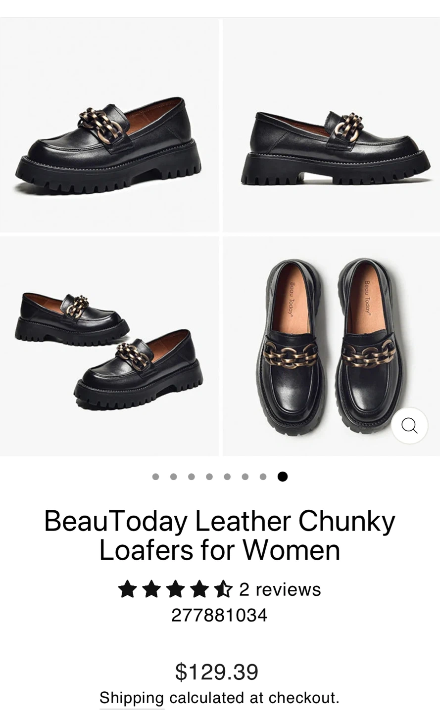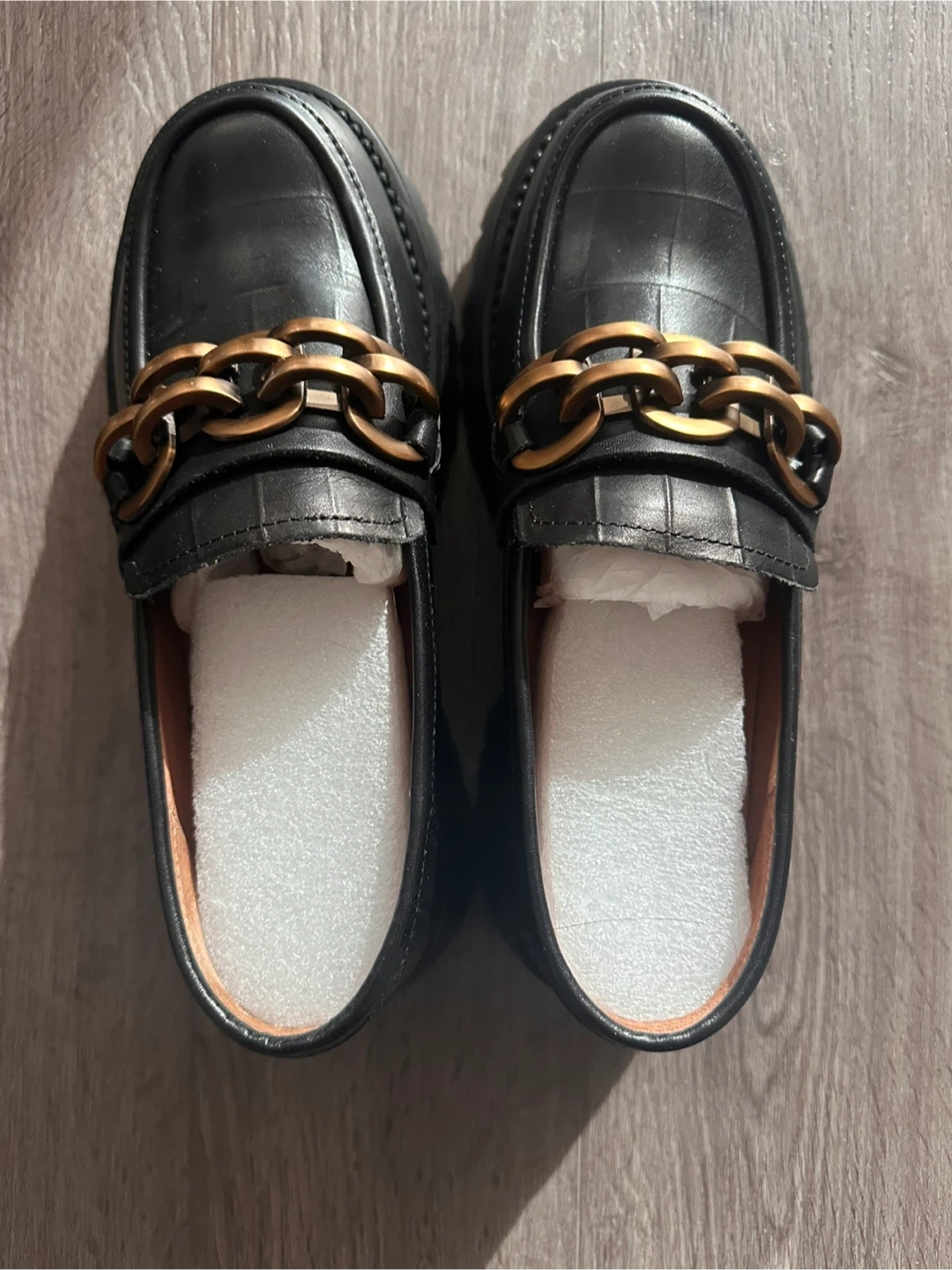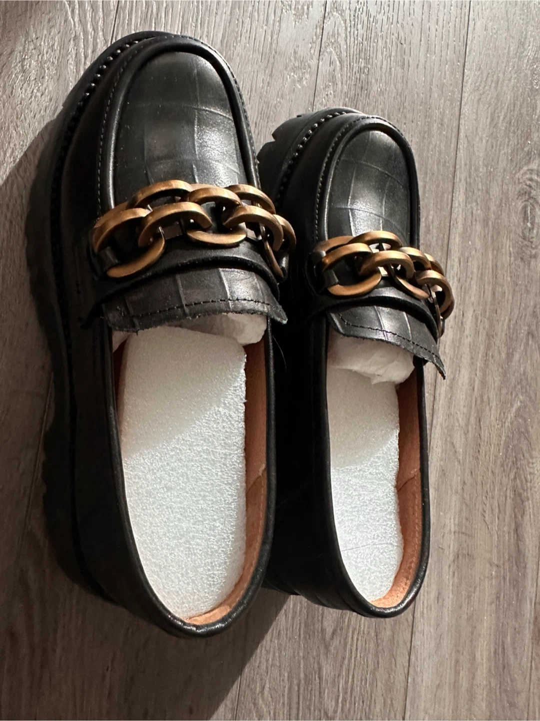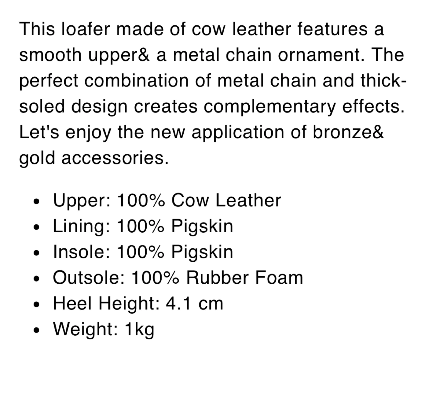 Here are some stylish black loafers with a chunky sole and a metal chain ornament! The upper is made of 100% cow leather, the lining is 100% pigskin, the insole is 100% pigskin, and the outsole is 100% rubber foam. The heel height is 4.1 cm and the weight is 1kg