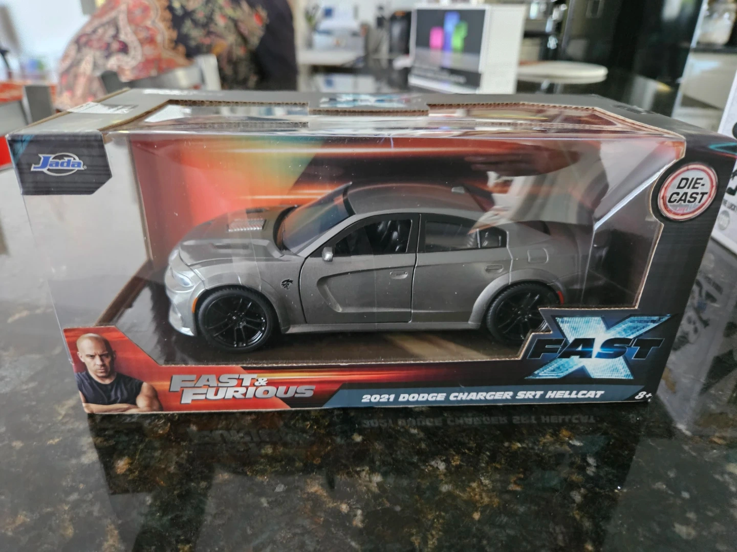 67Fast and Furious Dodge Charger (1:24, Grey) - Model Car 2021 Dodge Charger SRT Hellcat from the Film Fast & Furious 10. It's a die-cast car with parts that open. Brand new!