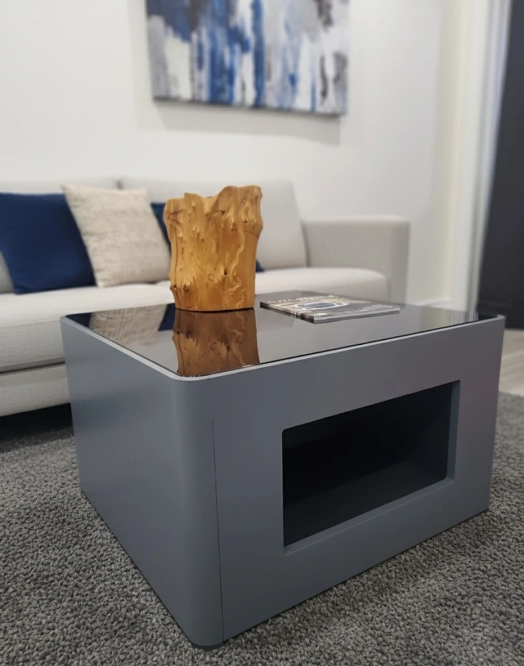 Selling a modern coffee table with a sleek grey finish and a glass top. It features a unique open shelf design, perfect for storing books or decorative items. The table is in great condition and would make a stylish addition to any living room