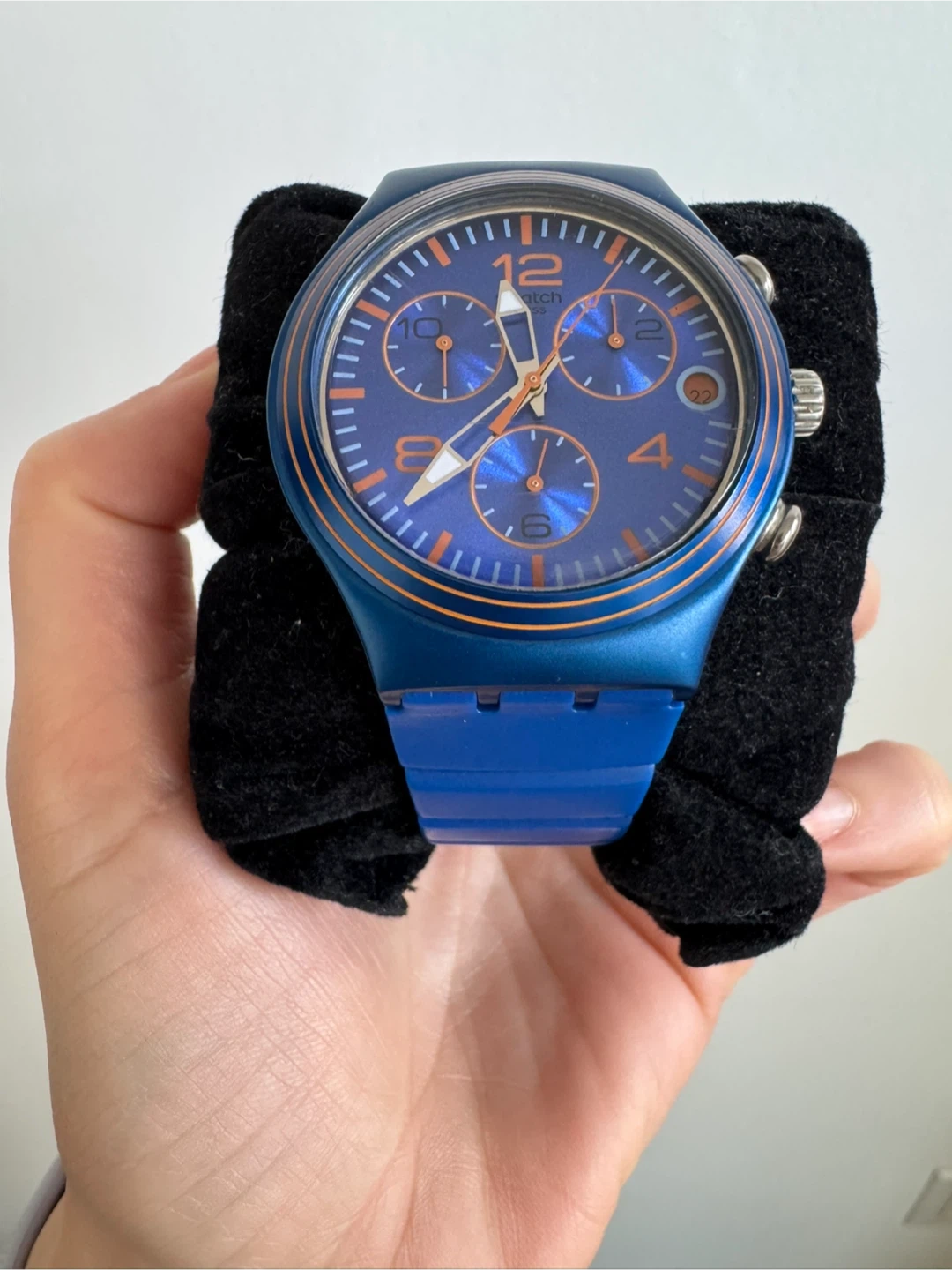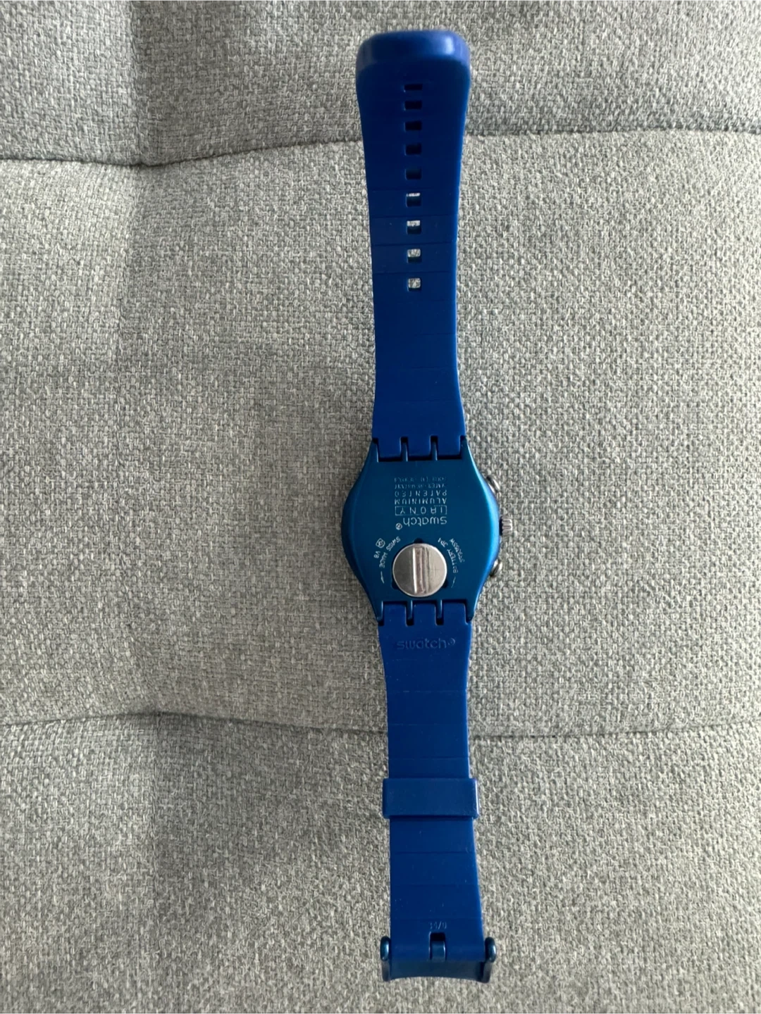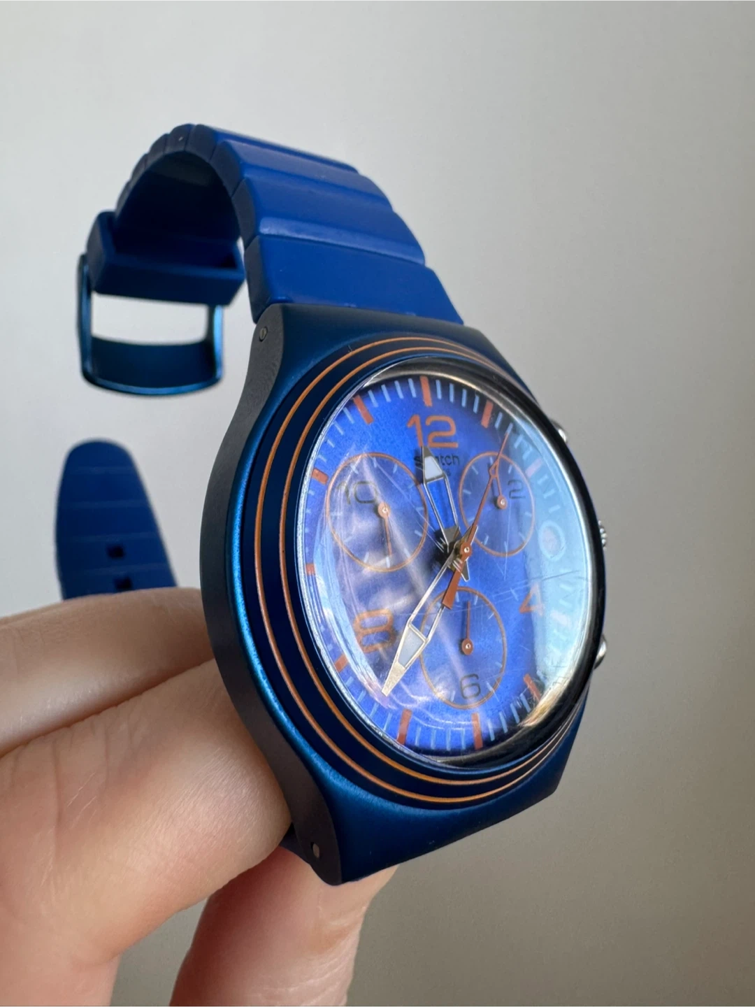 Selling a cool blue Swatch watch! It's in great shape, with minor scratches around the buckle only. The colour is a vibrant blue, and it's a really fun, stylish piece to wear.