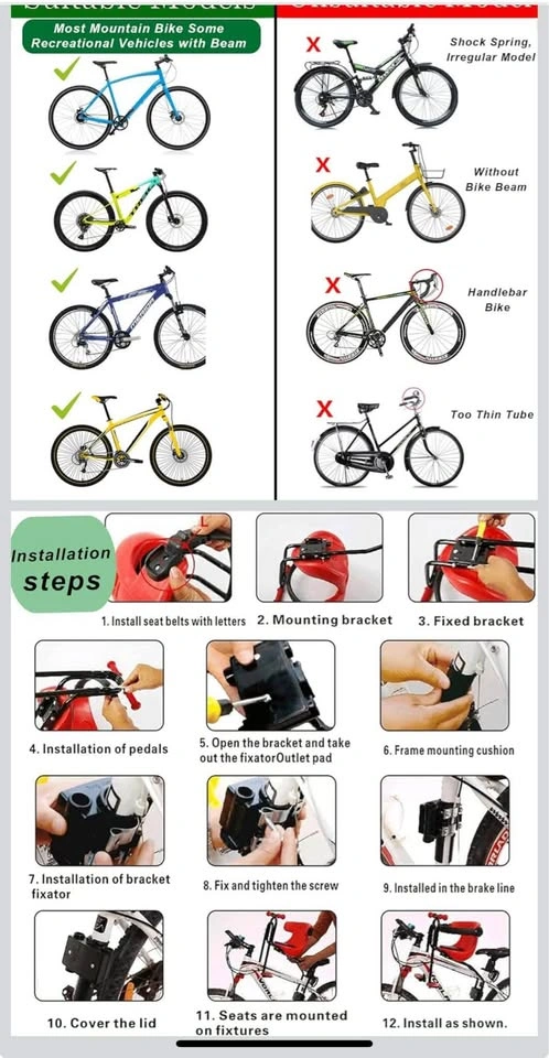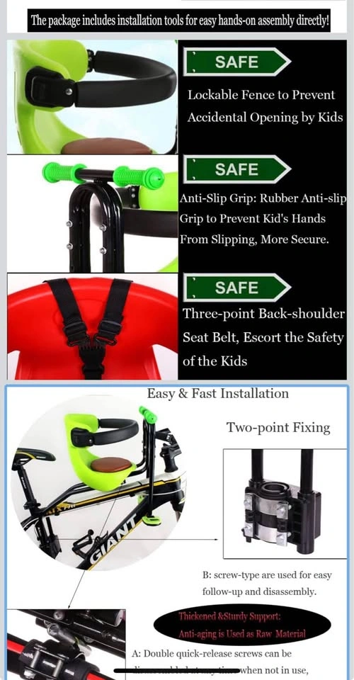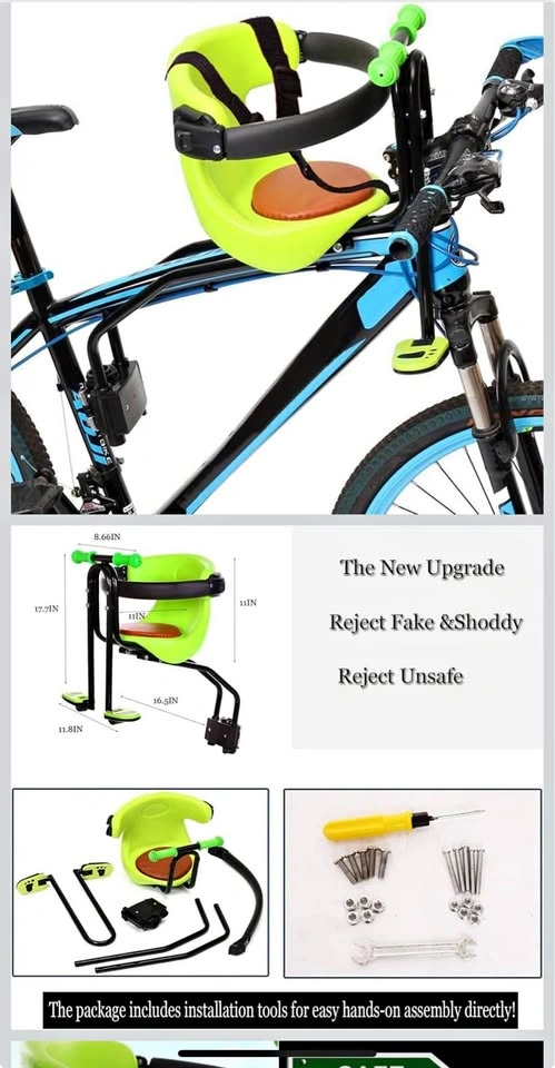 65Brand new in the box! Never opened or used! Front mounted child bike seat is great for taking a child with you. With your kids right before your eyes, you can communicate with him/her easily. It also provides a better view to the child compared to rear mounted seats. This bike seat can support children up to 110 pounds who are between 8 months - 4 years of age. The kids bike seat has a special quick release mount/dismount system that attaches and detaches the seat in mere seconds. This kids bike seat comes with 1* front mount bike seat, 1* seat belt, 1* wrench, 1* English instruction and installation kit for easy installation. And kids can hold on the handlebar while enjoying the view. The kids bike seat is easy to install and fits most adult bikes with front beam.