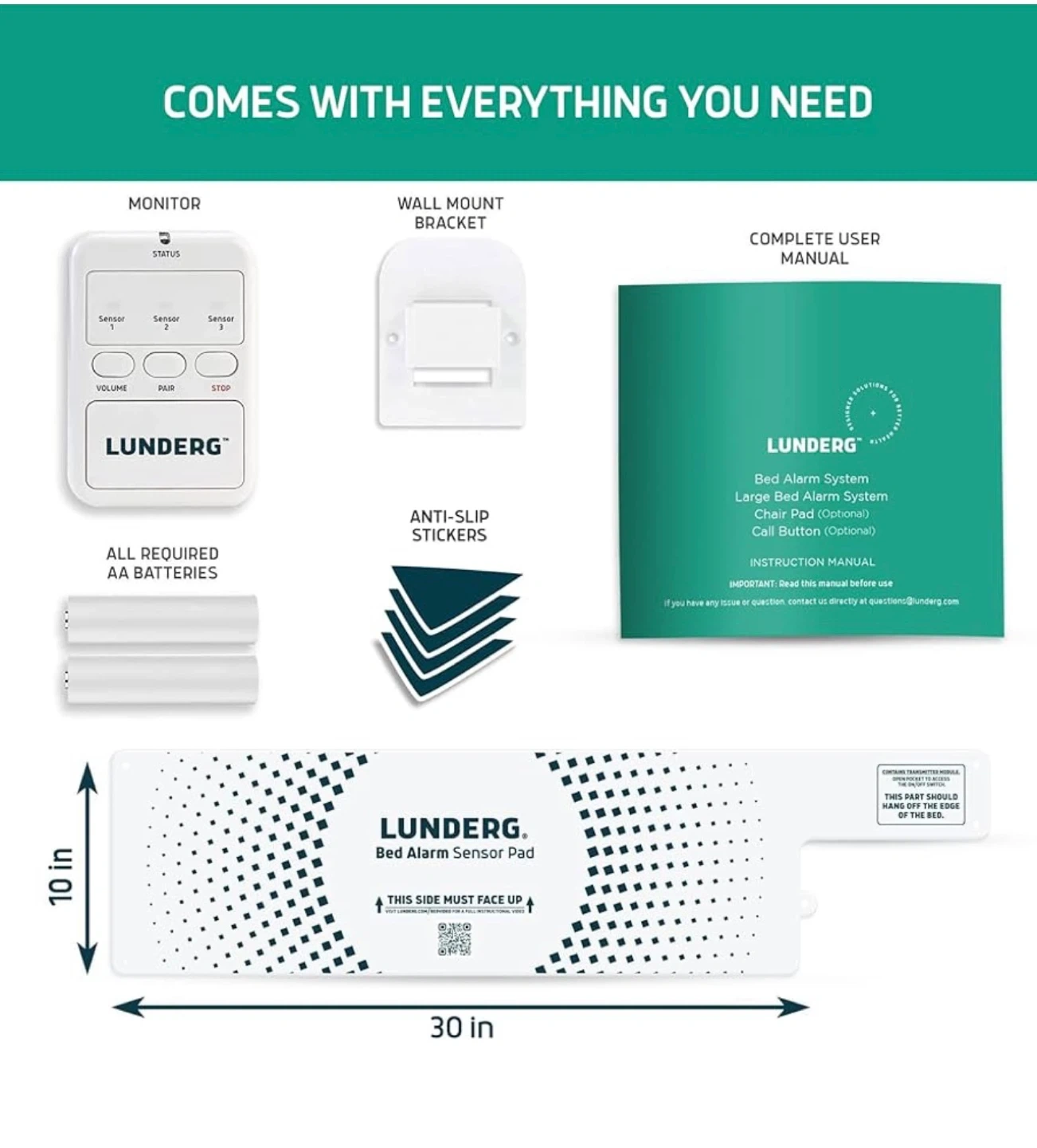 Lunderg Bed Alarm for Elderly Adults - Wireless Sensor Pad (10” x 30”) & Pager - Bed Alarms and Fall Prevention for Elderly and Dementia Patients