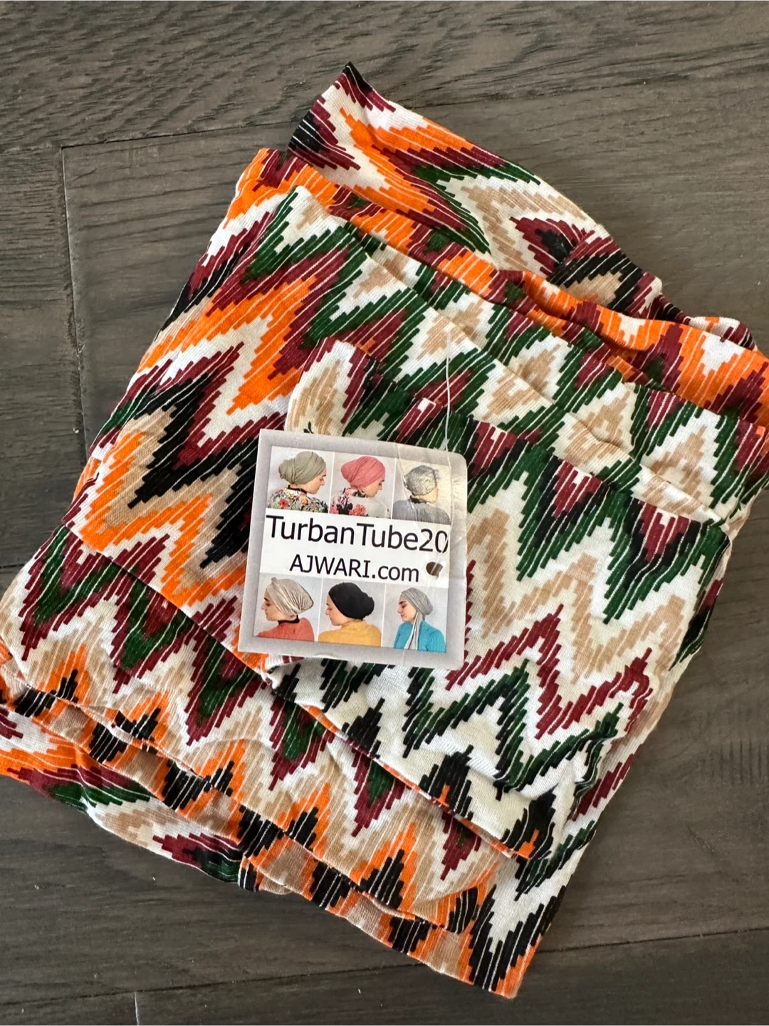 Here's a stylish head covering from AJWARI, the Turban Tube20! It features a vibrant, colourful pattern. Perfect for adding a unique touch to your look!