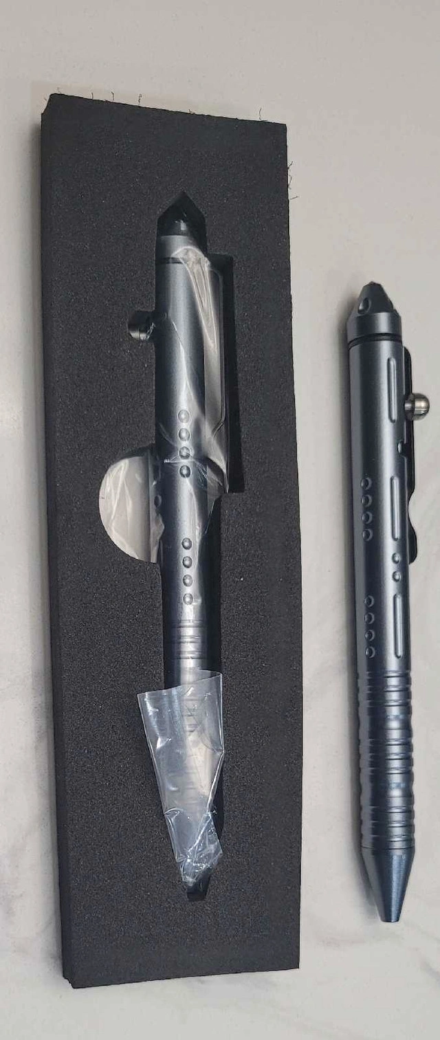 Tactical Bolt Action Ballpoint Pen with Emergency Glass Breaker, Aluminum Body, Tungsten Steel Tip, Grey, Black Ink, EDC, Outdoor, Gift We have 10 in stock. This brand new tactical pen is made from aircraft aluminum, making it lightweight and durable. It's not just a pen, it's a multi-tool for everyday carry. It has a glass breaker, a smooth writing ballpoint, and a sturdy clip. Ready to write, break, and defend, it's the James Bond of pens! If the ad's up, it's up for grabs! Pickup in Brampton near Sheridan College Davis campus