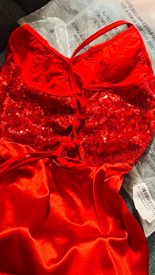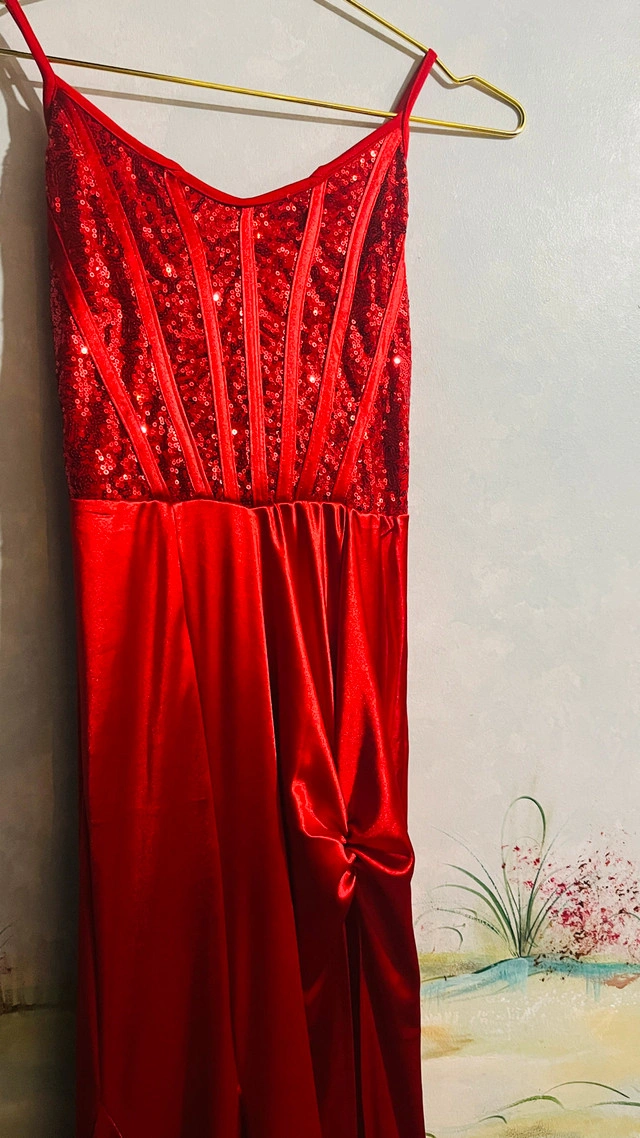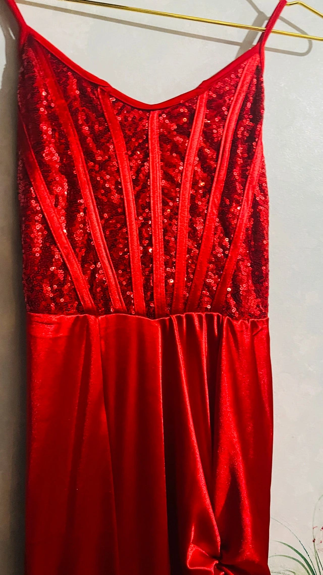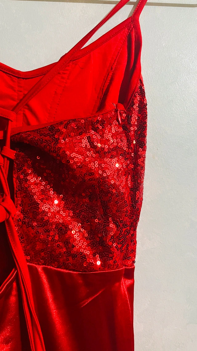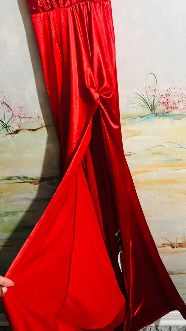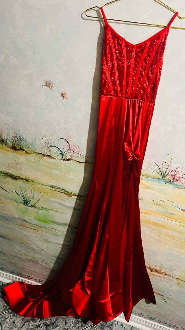 118This is a stunning brand new red formal dress, perfect for making a statement at any special event. It features a sequined bodice and a sleek, flowing skirt with a side detail. this dress is elegant along with a thigh high slit and sweep train to complete the look. * Sequin Bodice * Sleek Skirt * Side Tie Detail * Silhouette: Fit and Flare. Was unable to take proper pictures, but this dress is beautiful. pick up is in Brampton near Sheridan College