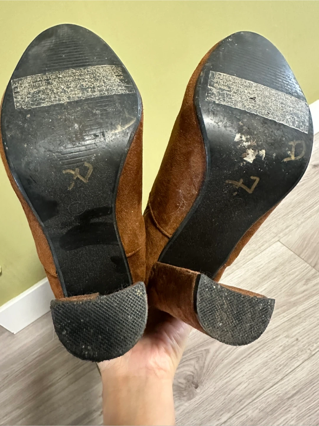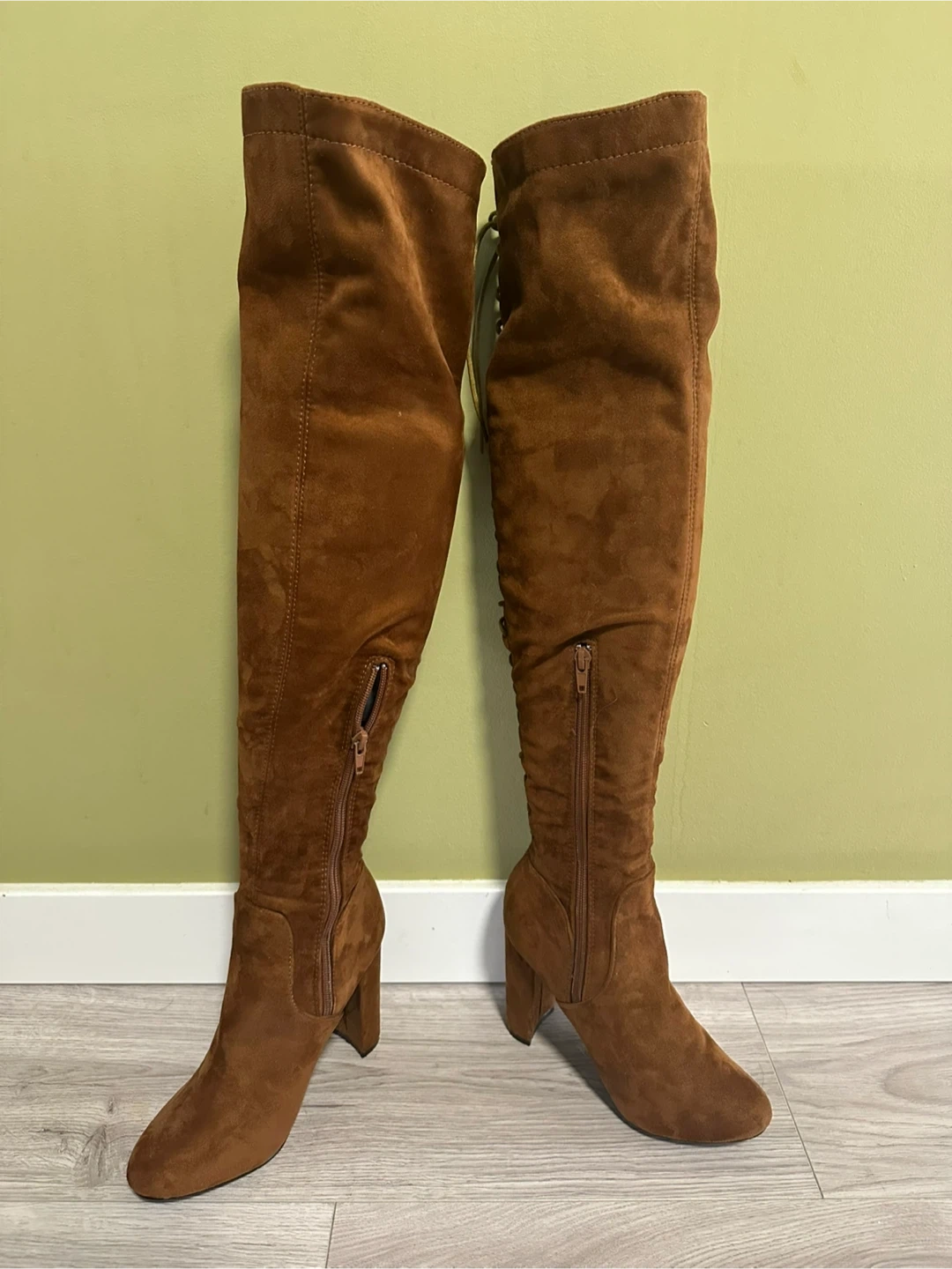 They have a 4” block heel and a lace-up detail in the back. Total height of the boot is 24”