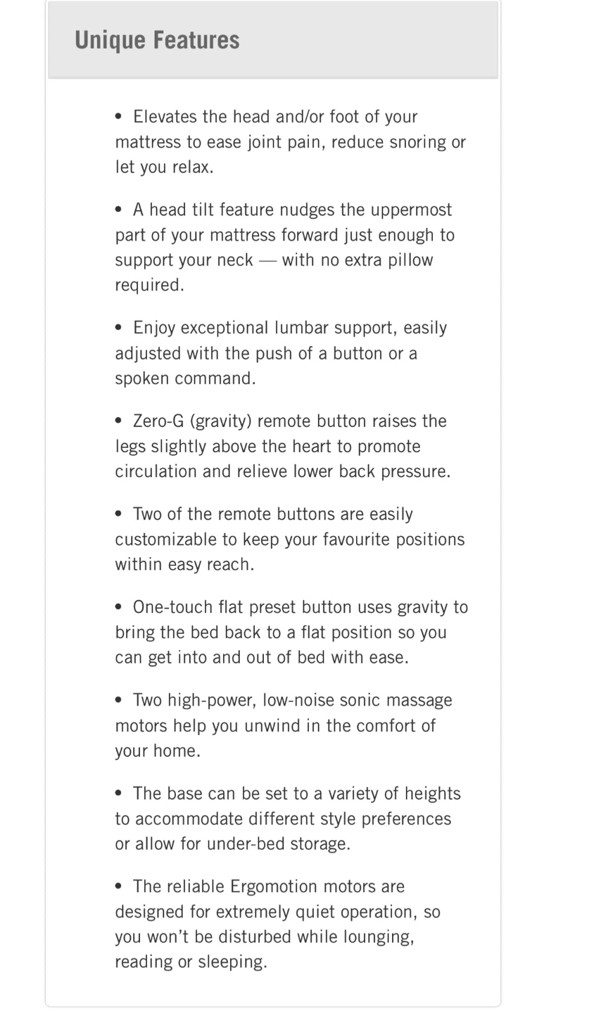 Create the customizable relaxation experience you’ve been searching for thanks to this Quest 4.0 adjustable base. Use the wireless remote to easily choose the perfect positioning for different areas of your body to truly personalize your rest. Whether you prefer to lay flat or want to relax in a more upright position, this adjustable base will cater to your needs. Equipped with a variety of technology-driven features and designed with a slim look, this Quest 4.0 adjustable base will make a wonderful addition to your bedroom.