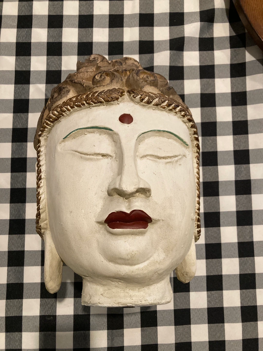 Here's a Buddha head statue, perfect for adding a touch of serenity to your space! It's in great condition and ready to find a new home