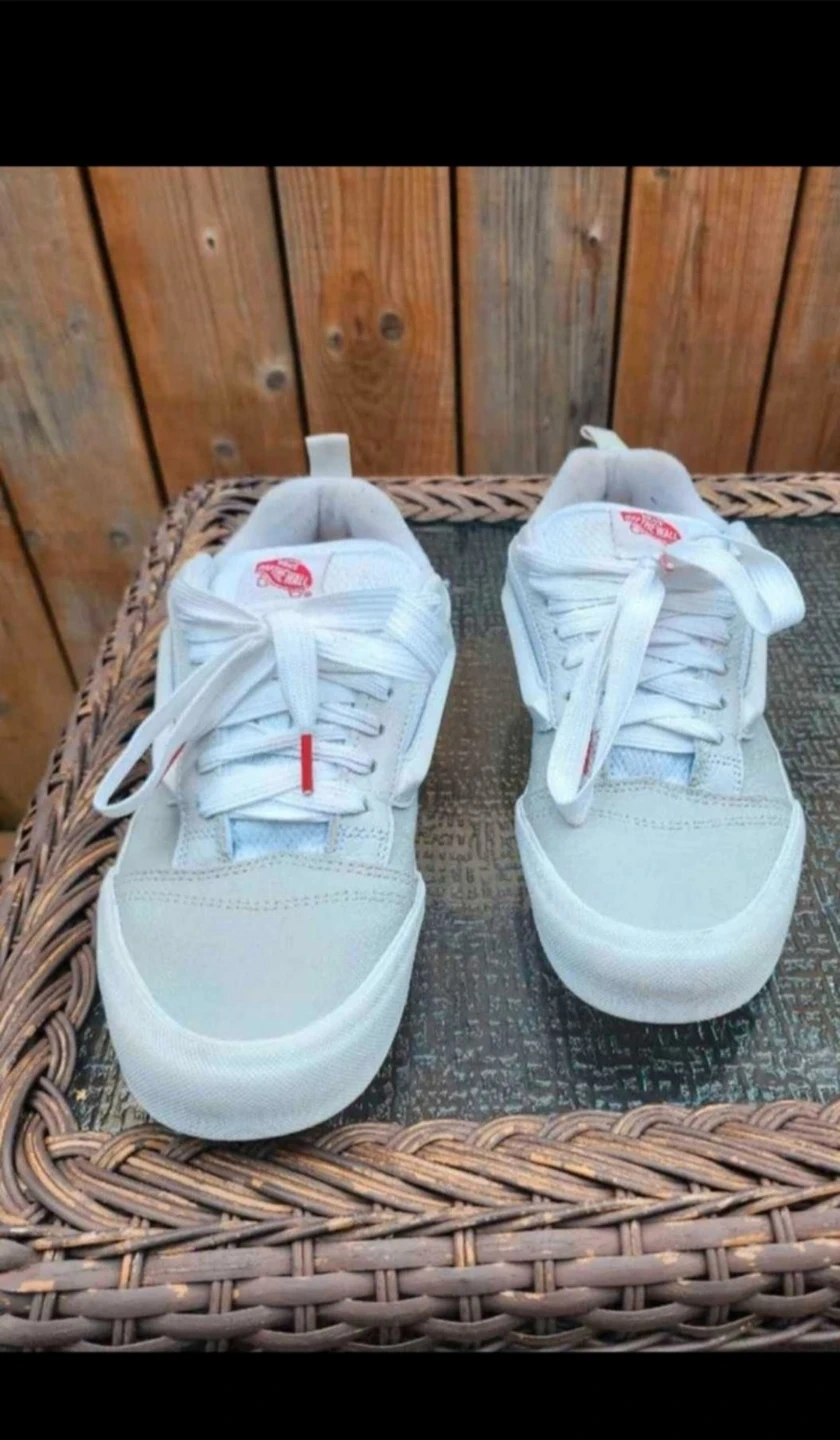 Pair of men's "Knu Skool" Vans Skate Shoes, white on red.