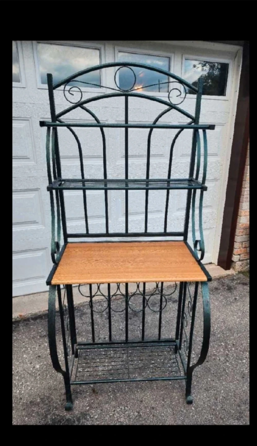 Antique bakers rack with wine bottle holders. Perfect for extra counter and storage space for kitchen or basement.