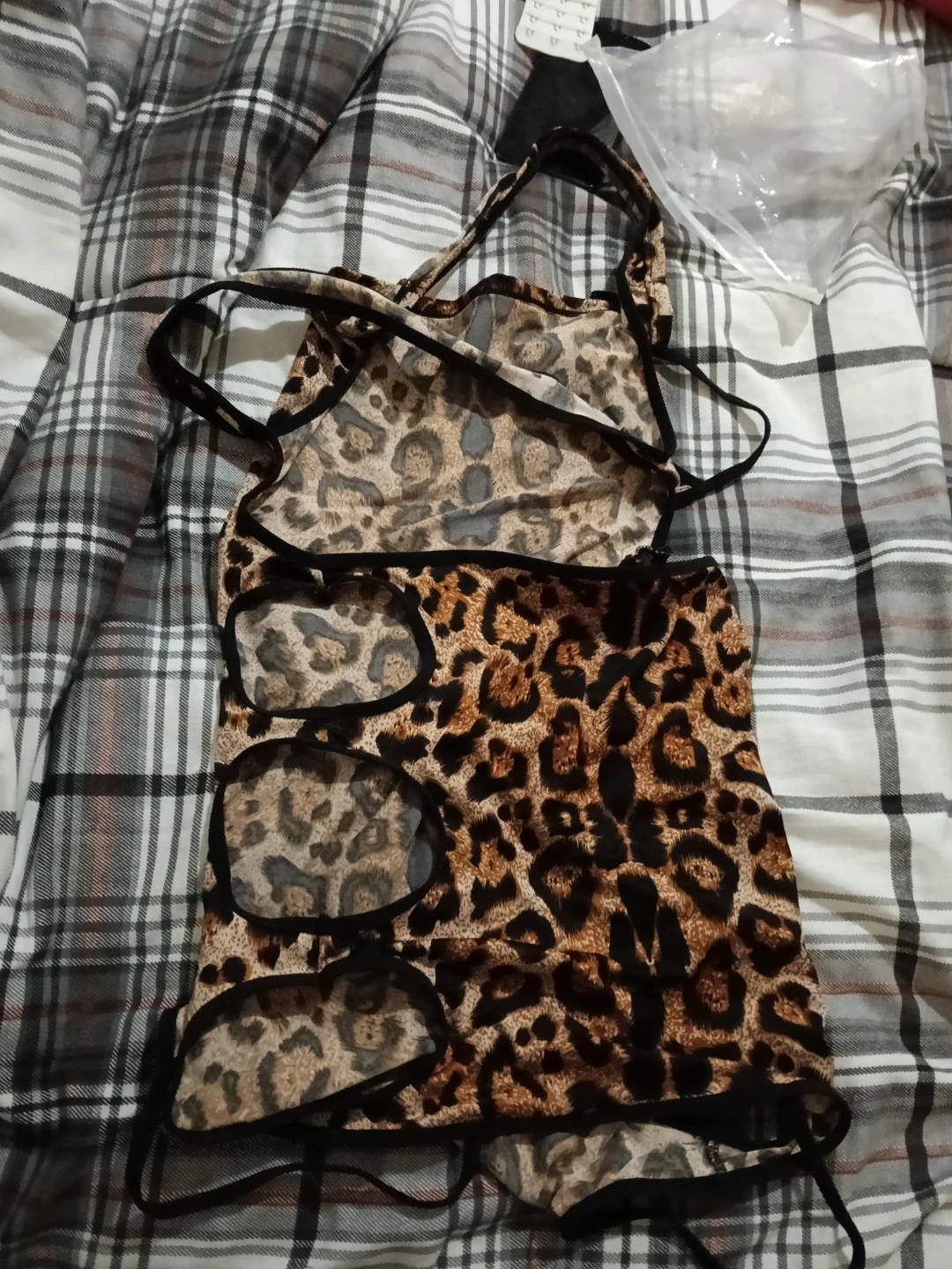 This is a cute leopard print lingerie set, perfect for adding a bit of fun to your wardrobe! It features a unique design with black trim and a playful pattern. Comes in a plastic bag.