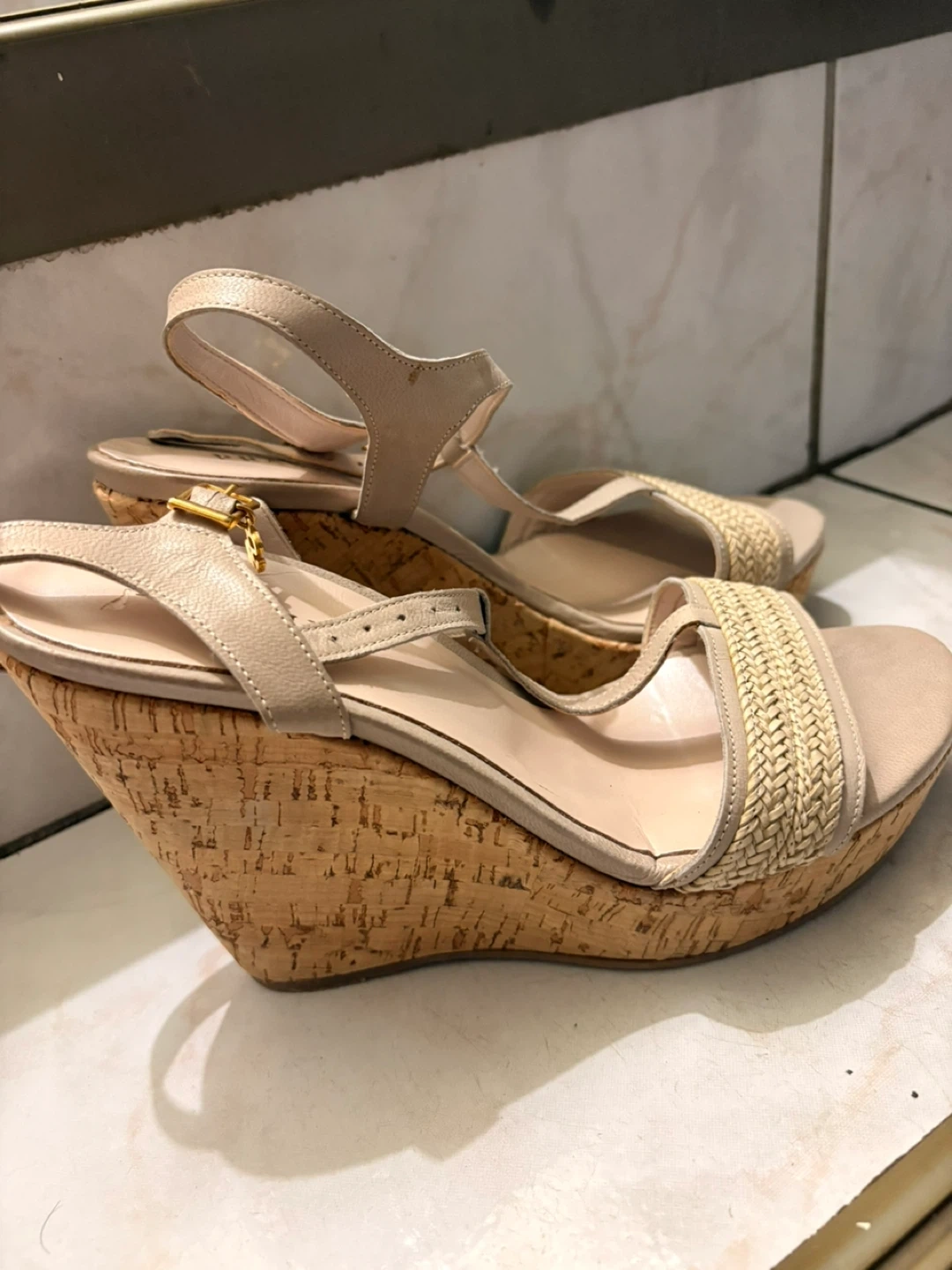 Cute Talbots wedge sandals in a neutral beige colour! These are a size 8.5 and would be perfect for summer. They feature a cork wedge heel and woven detailing on the front strap. The ankle strap is adjustable for a comfortable fit