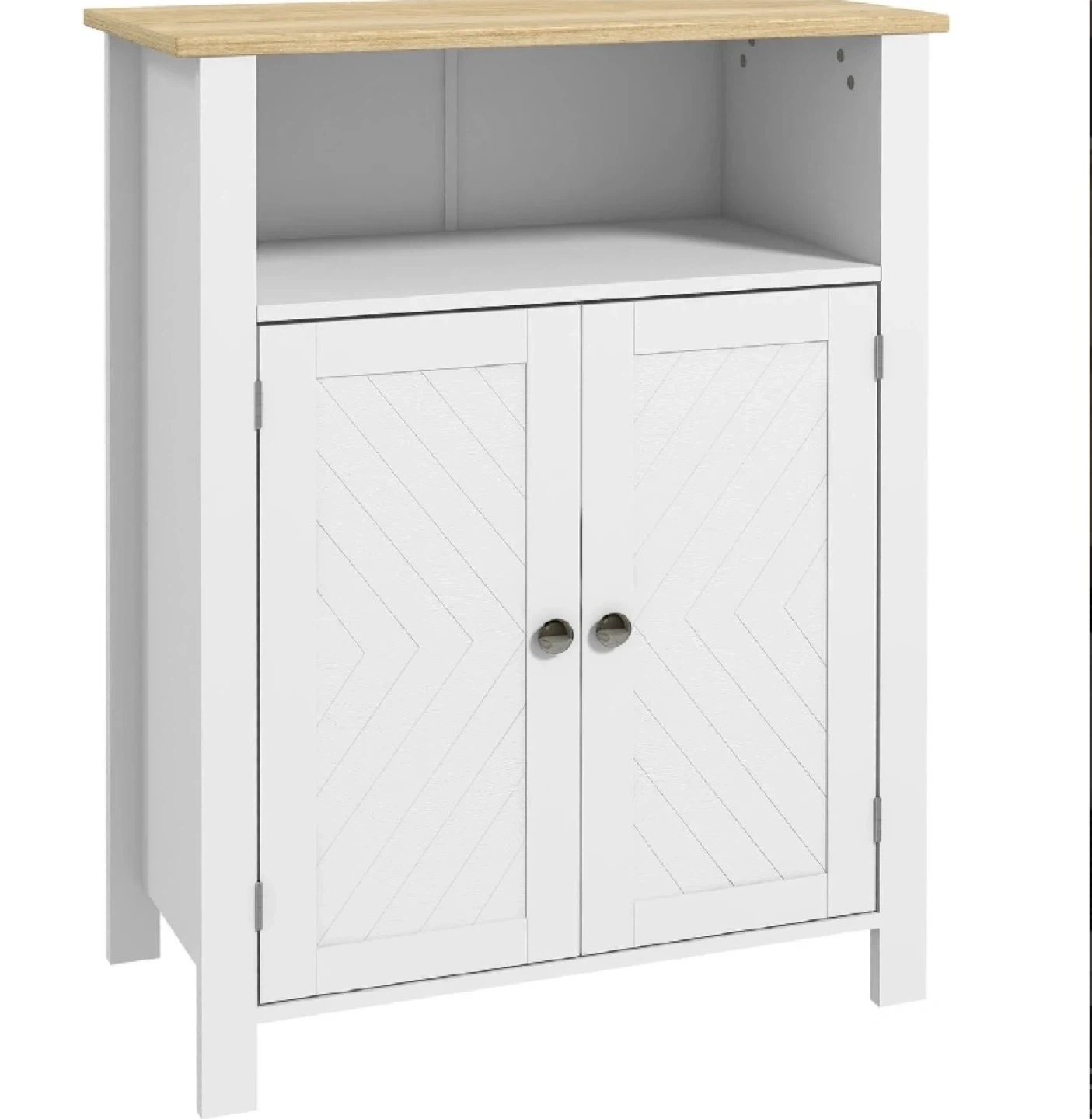 This Kleankin bathroom storage cabinet is brand new in its original packaging, ready to assemble and enhance your bathroom decor. Featuring a stylish design with a white finish and natural wood-tone top, it offers both open and closed storage options to keep your essentials organized and accessible. The cabinet includes a two-door compartment and an open shelf, providing ample space for towels, toiletries, and other bathroom necessities.
