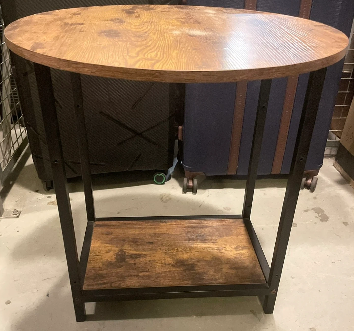 It's perfect for small spaces and has a rustic, wood-like finish on the top and shelf.