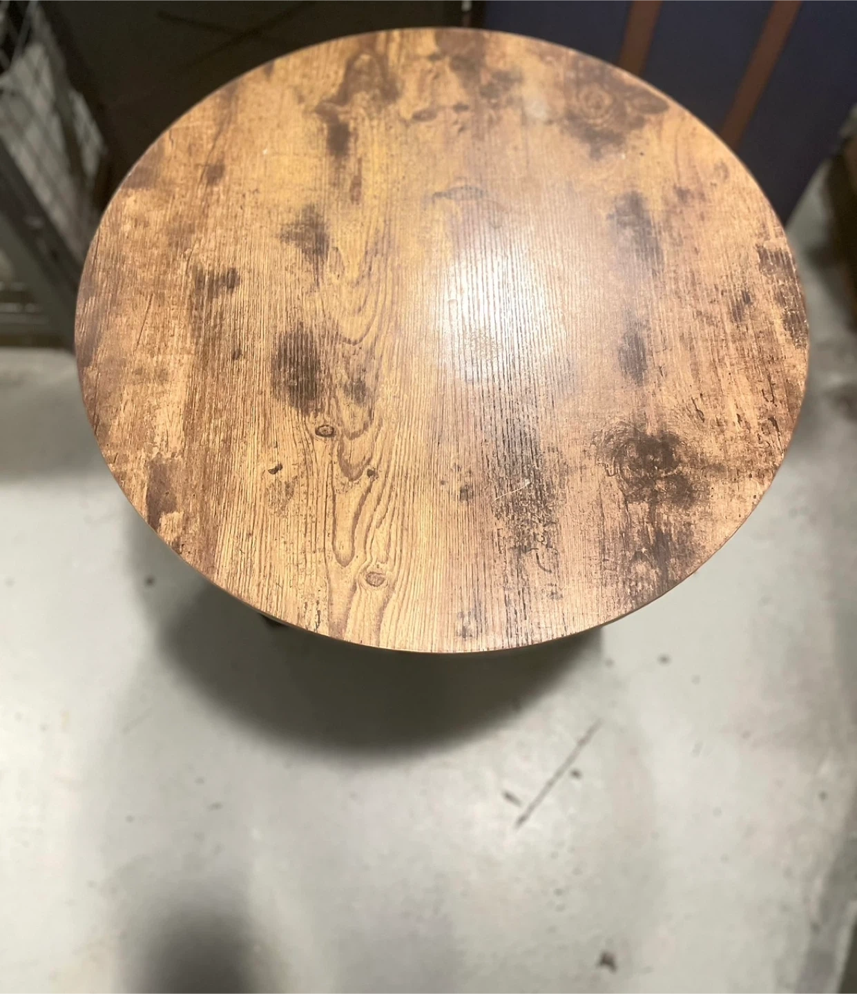 It's perfect for small spaces and has a rustic, wood-like finish on the top and shelf.