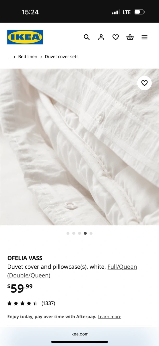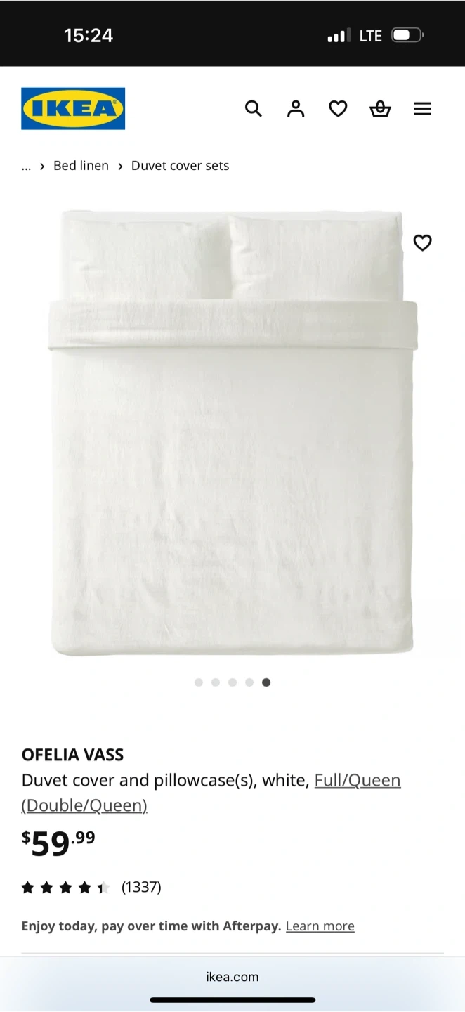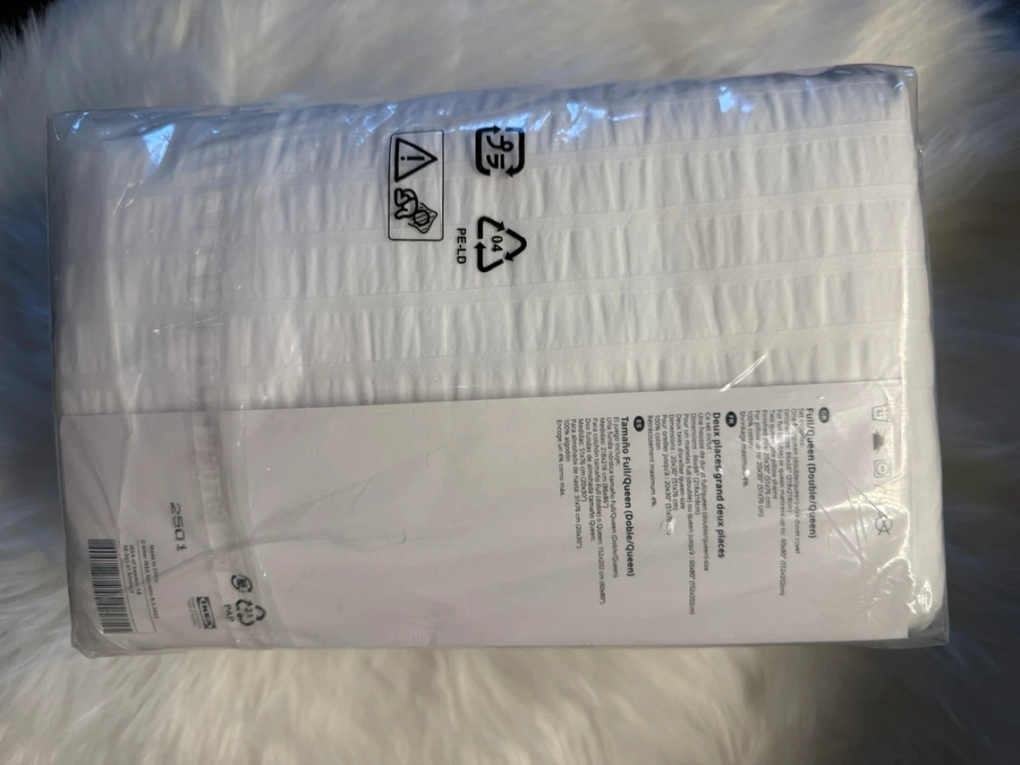 Selling a brand new IKEA Ofelia Vass duvet cover and pillowcase set in white! It's a Full/Queen size, still in its original packaging. 100% cotton. Originally bought for $59.99 plus tax