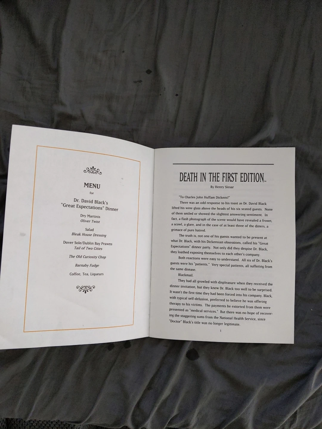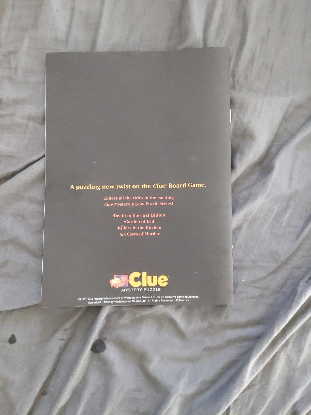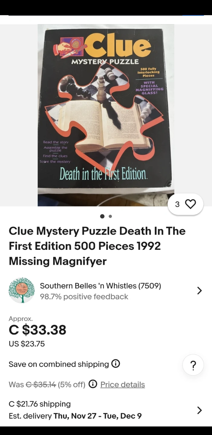 Selling a Clue Mystery Puzzle, Death in the First Edition. It is a jigsaw puzzle mystery that includes a one-piece jigsaw puzzle and one short mystery story featuring all six Clue characters. It also includes one special Clue decoding magnifying glass to reveal the solution