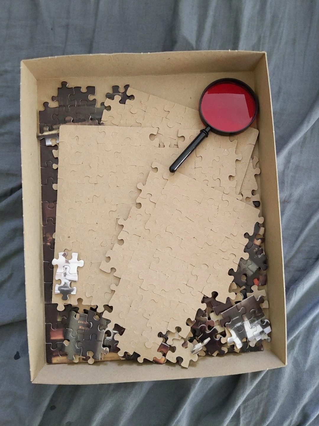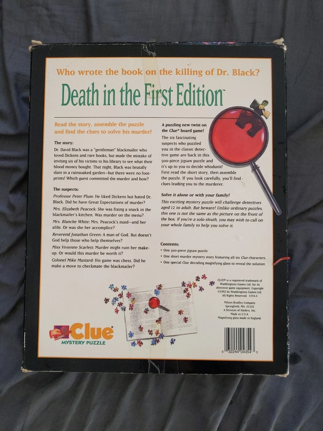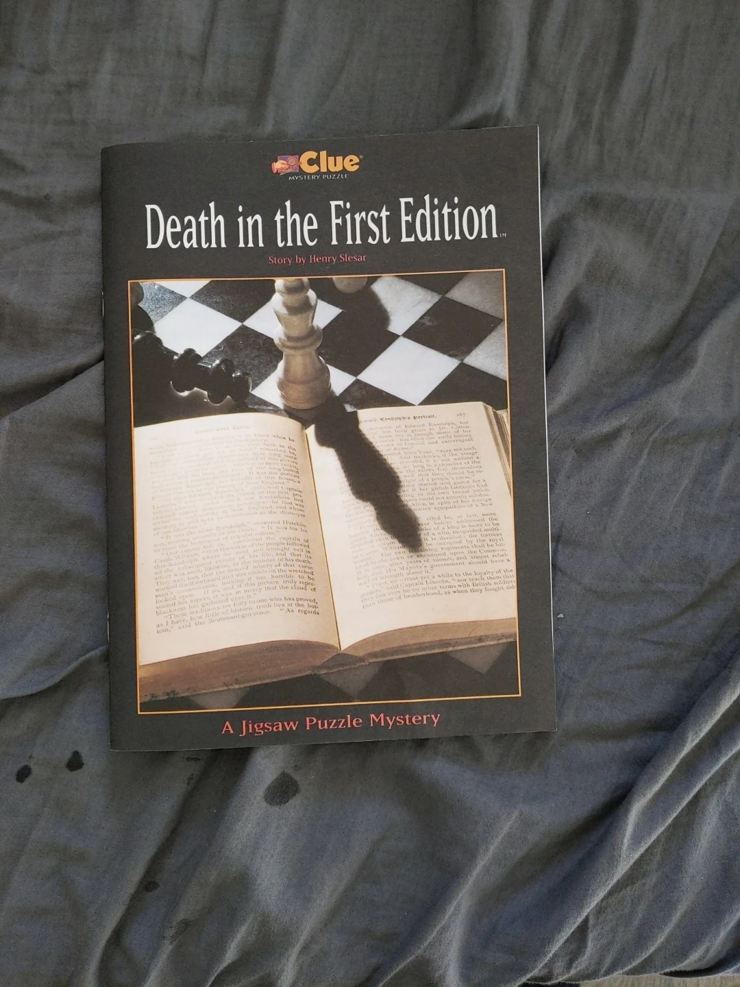 Selling a Clue Mystery Puzzle, Death in the First Edition. It is a jigsaw puzzle mystery that includes a one-piece jigsaw puzzle and one short mystery story featuring all six Clue characters. It also includes one special Clue decoding magnifying glass to reveal the solution