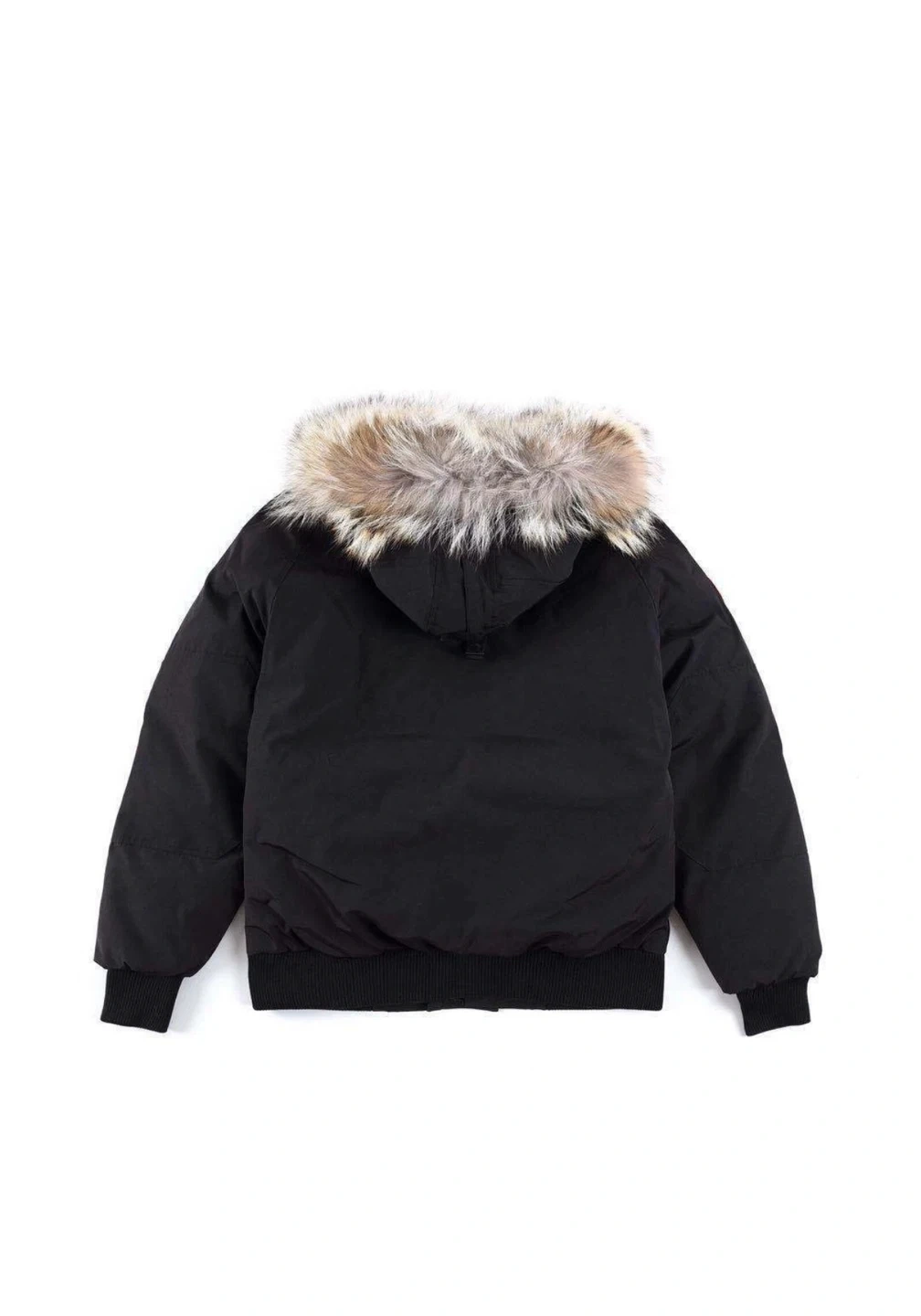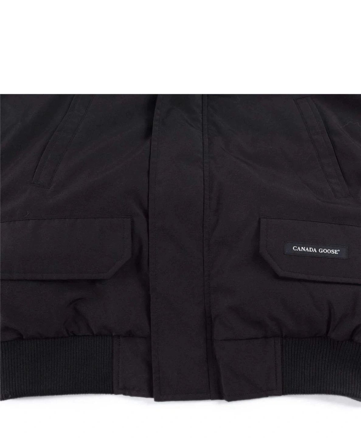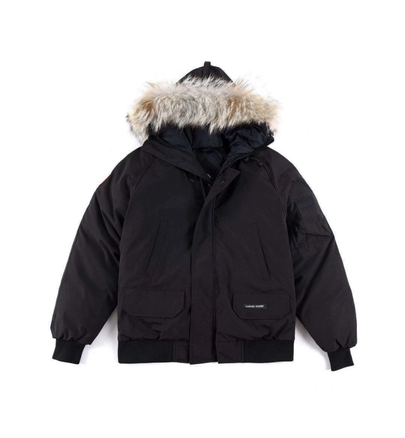 Selling a stylish black bomber jacket from Canada Goose! It's in great condition and ready to keep you warm. The jacket features a fur-trimmed hood and multiple pockets. Perfect for those chilly days!