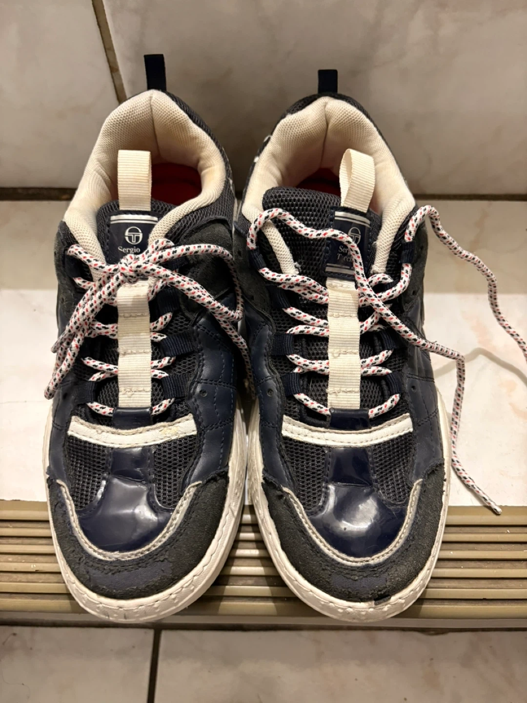 Selling a pair of Sergio Tacchini sneakers. They show some signs of wear, but still have plenty of life left in them! Perfect for casual wear or hitting the gym.